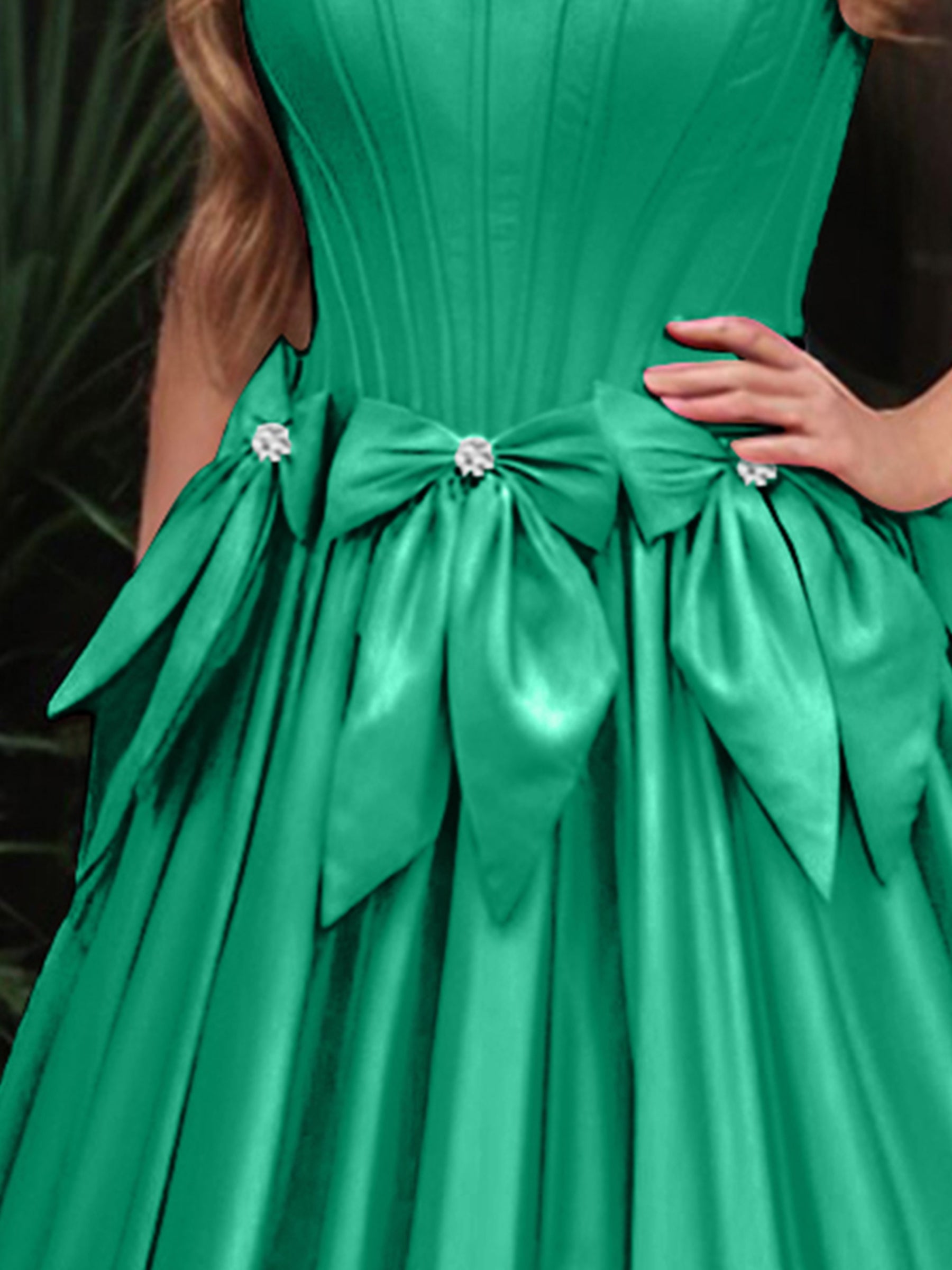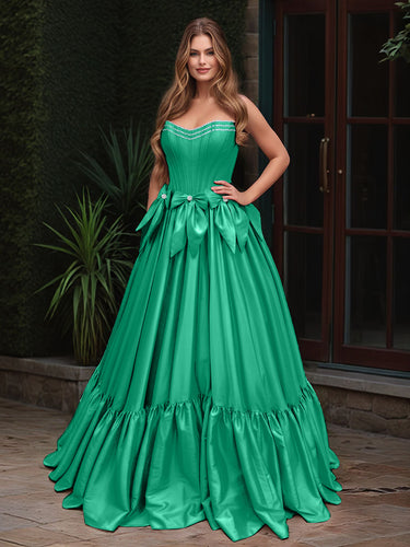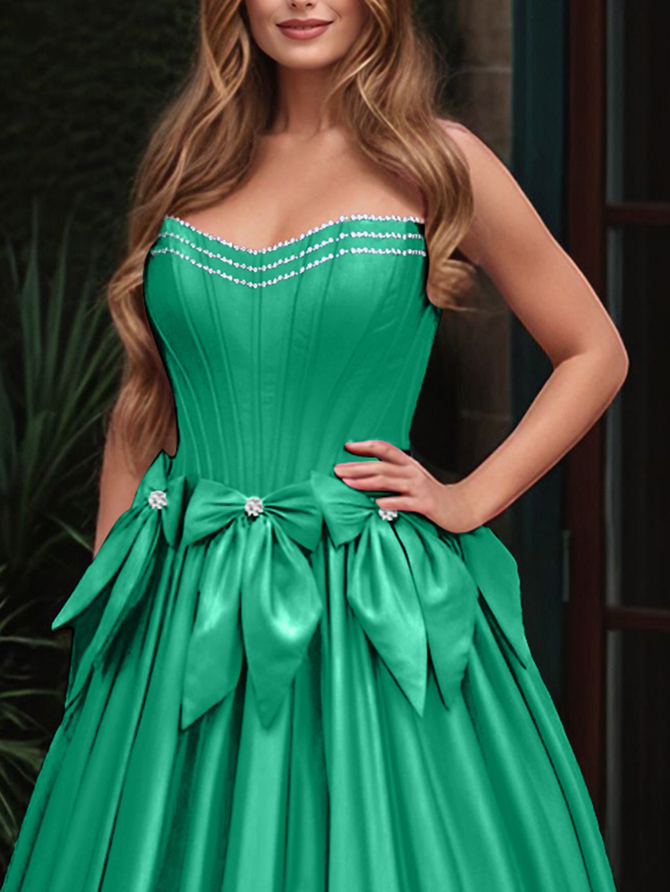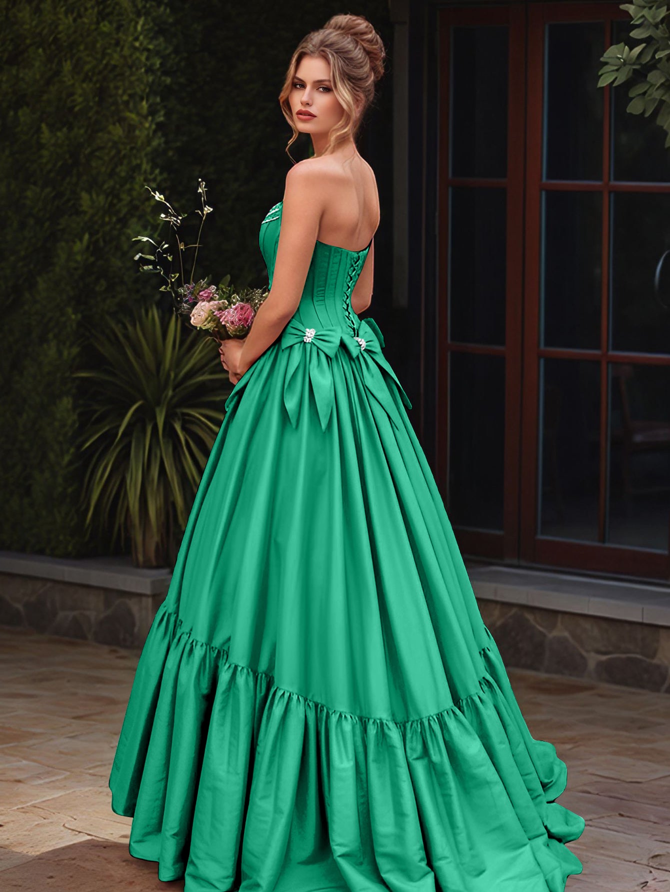 Boned Top Strapless Beaded Ball Gown Prom Dress With Bow - Emerald Green