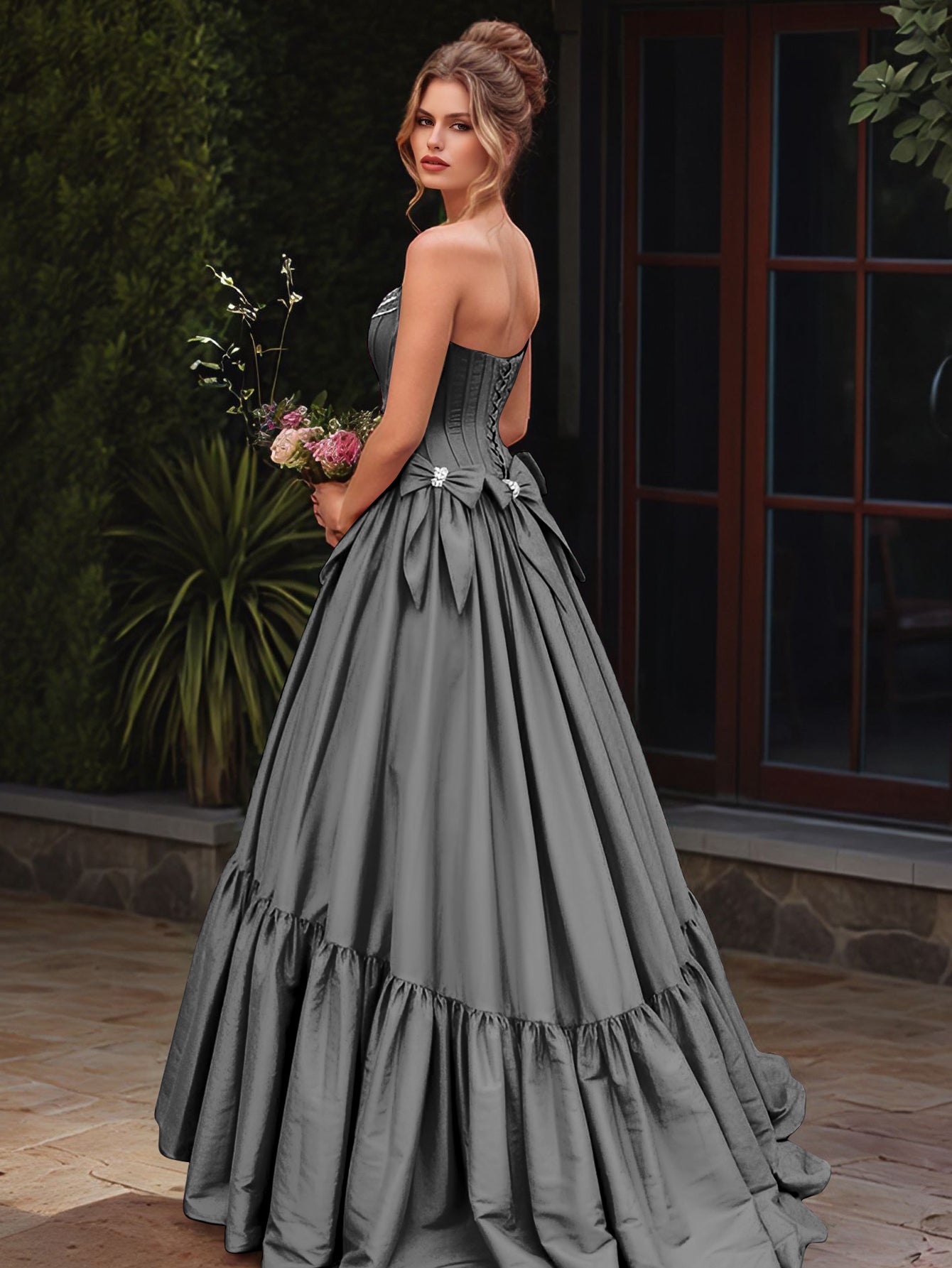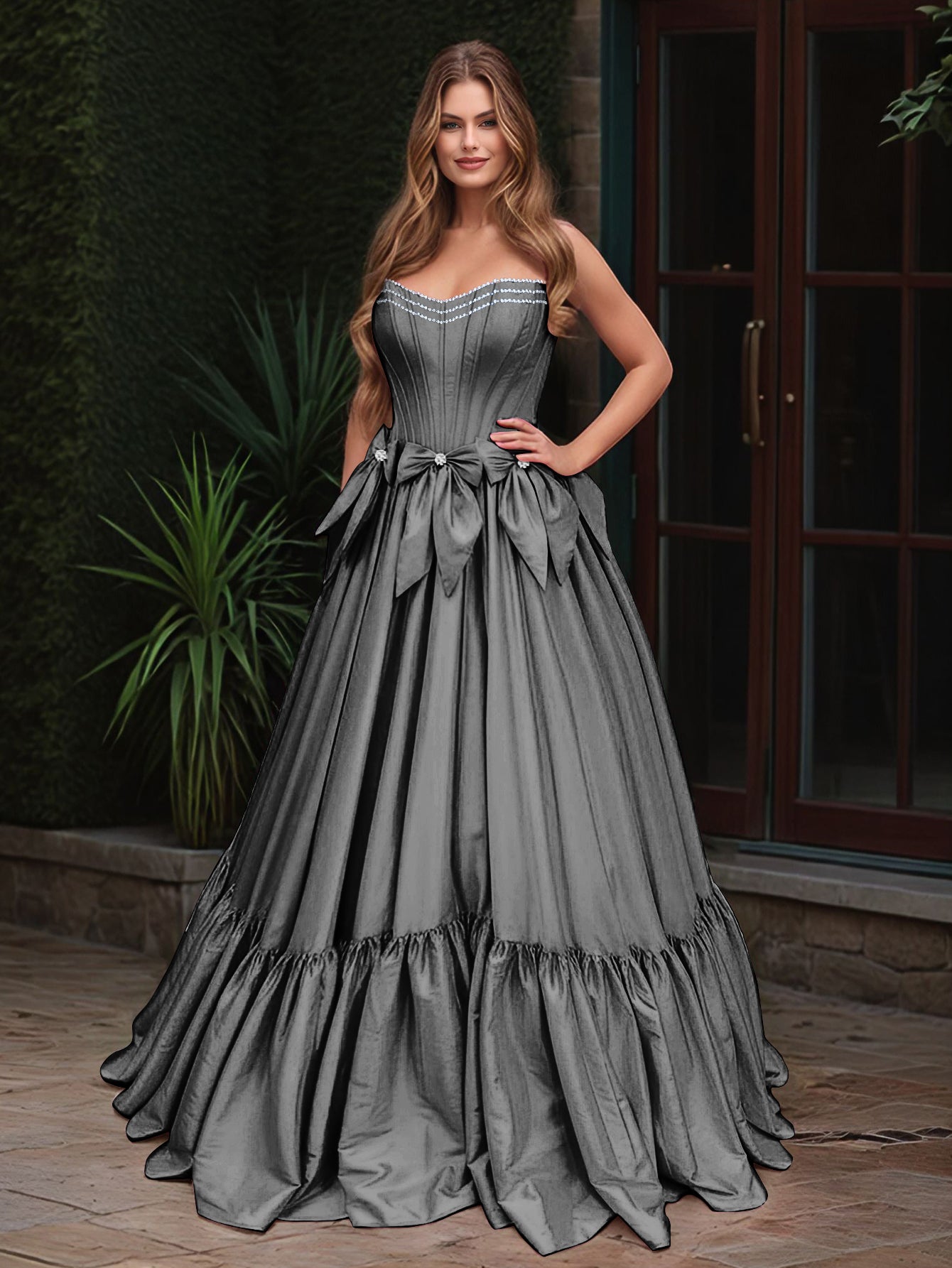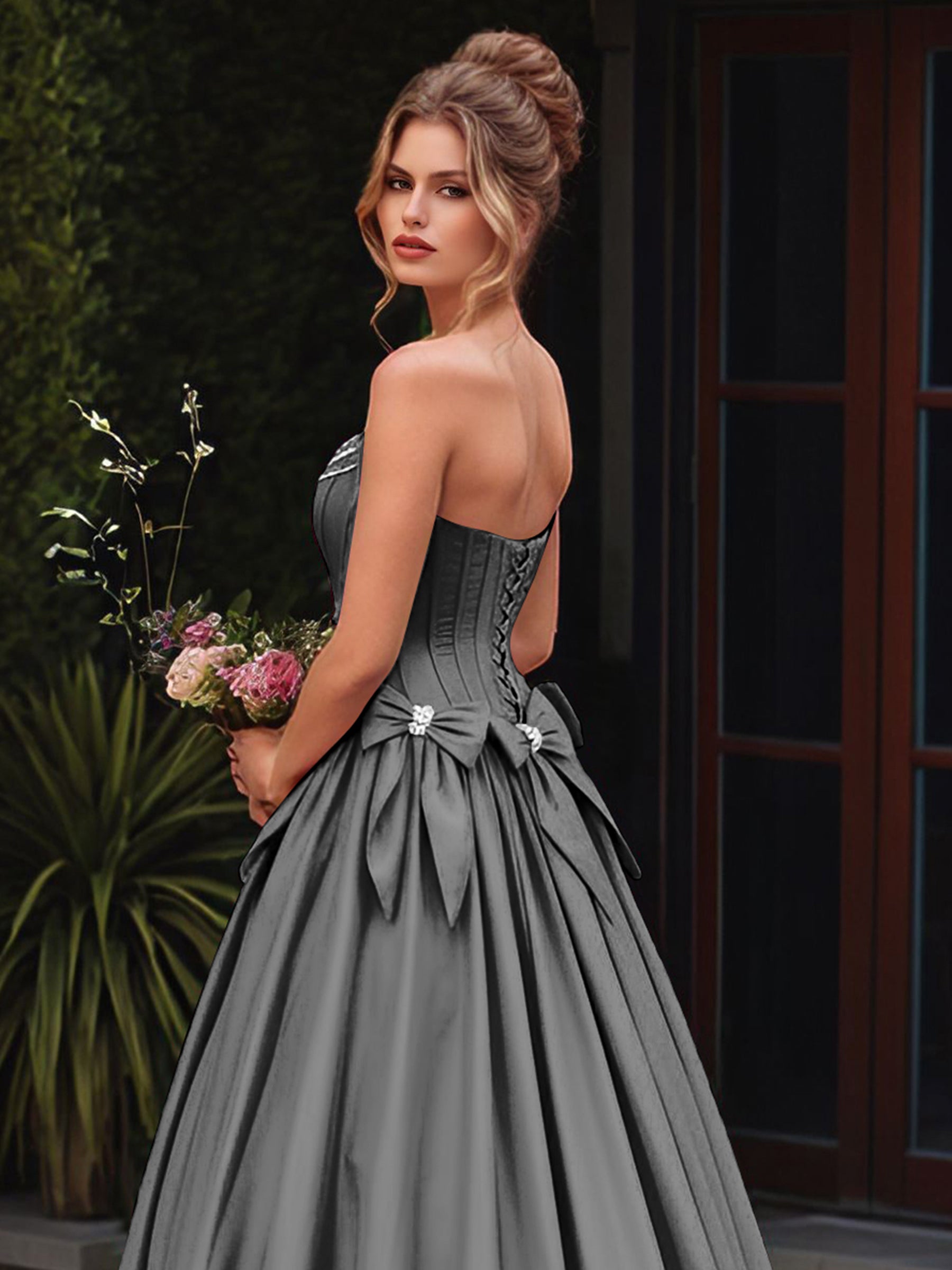 Boned Top Strapless Beaded Ball Gown Prom Dress With Bow - Grey