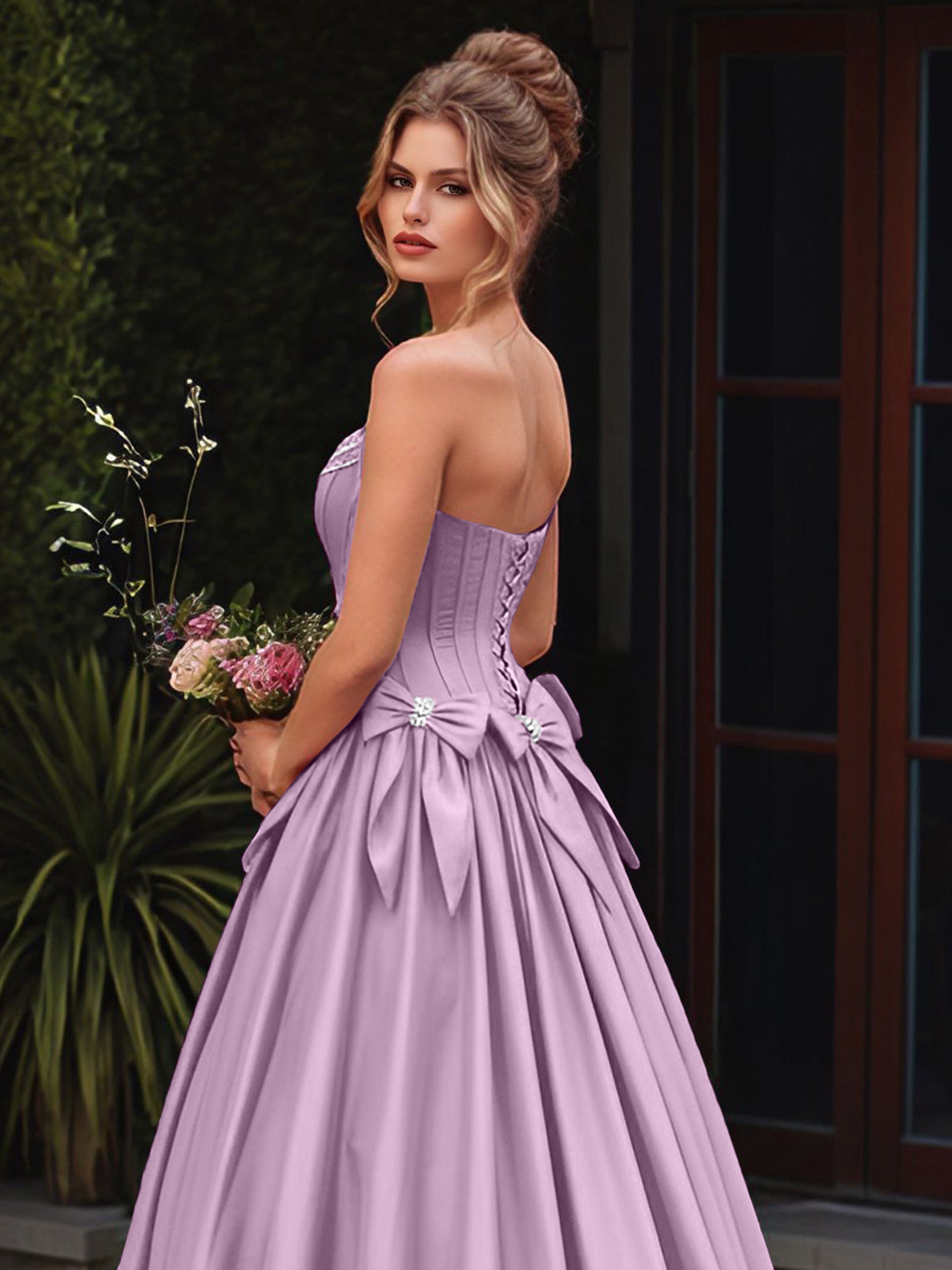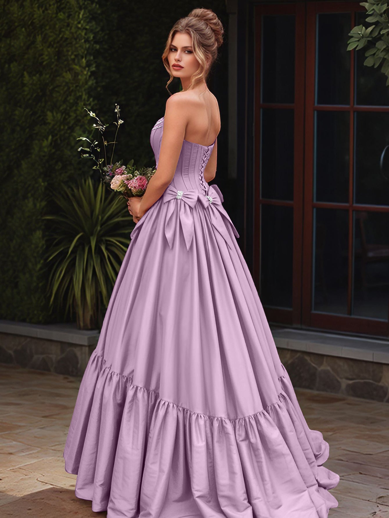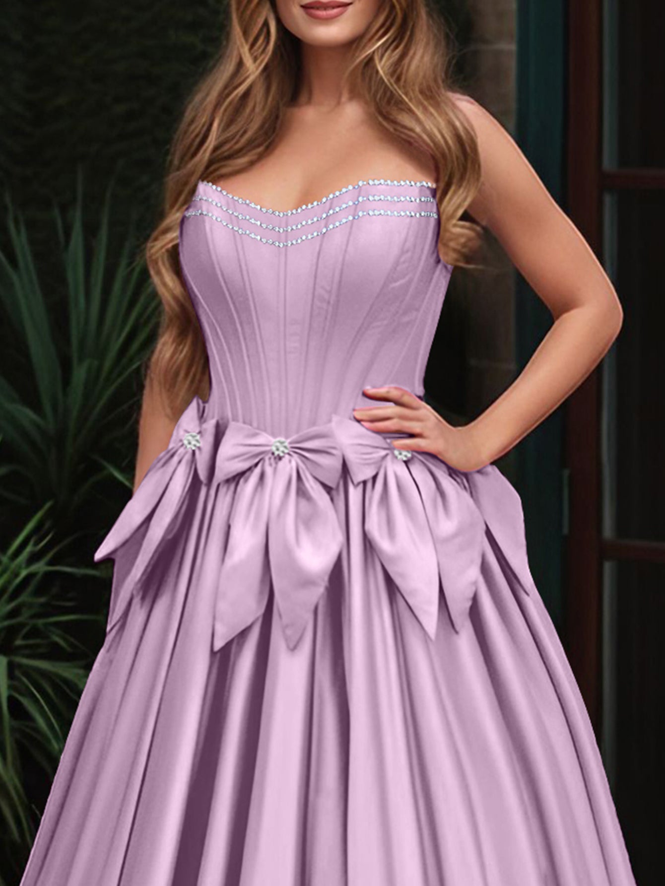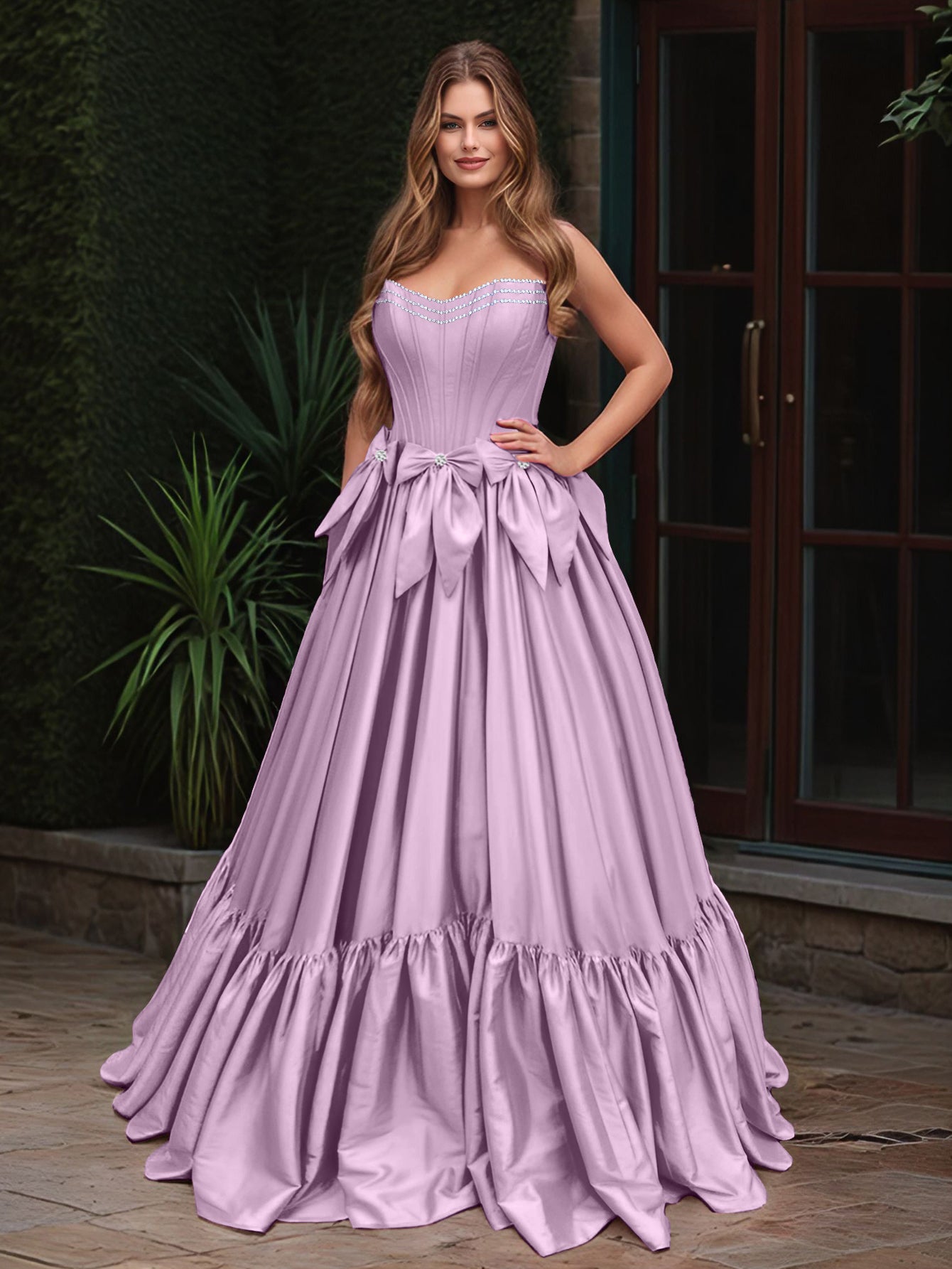 Boned Top Strapless Beaded Ball Gown Prom Dress With Bow - Lilac
