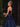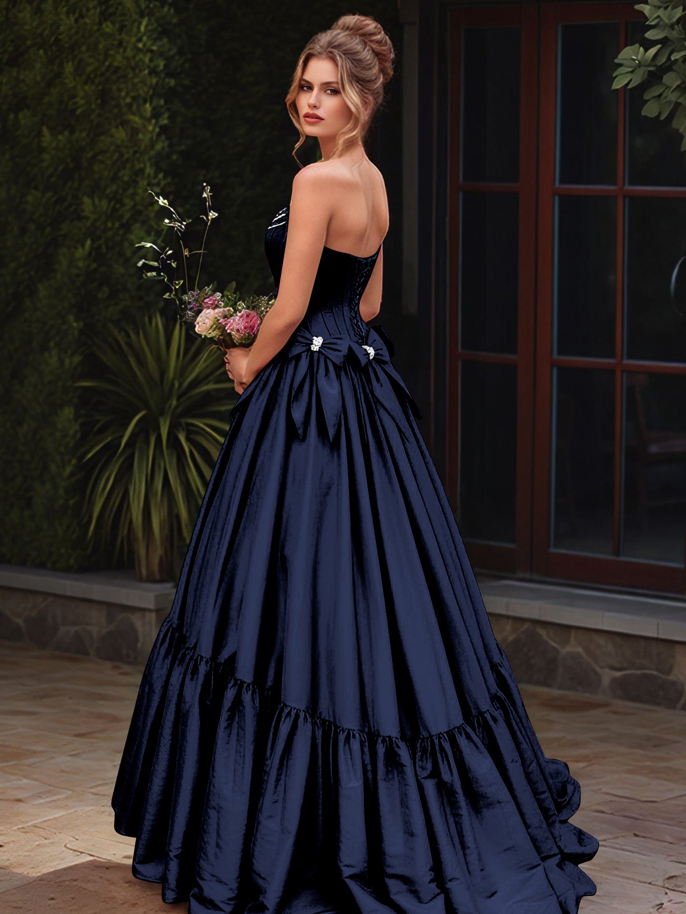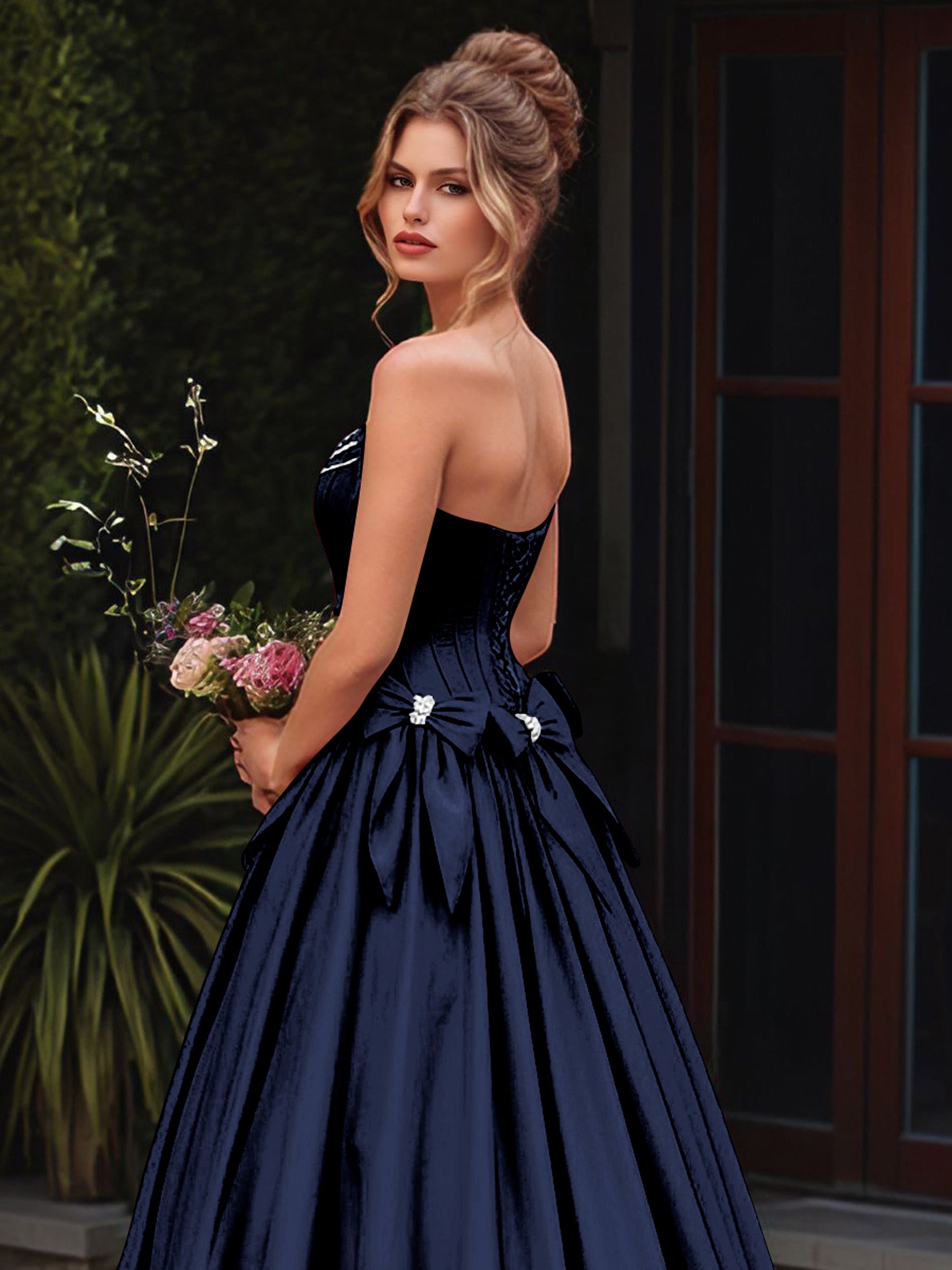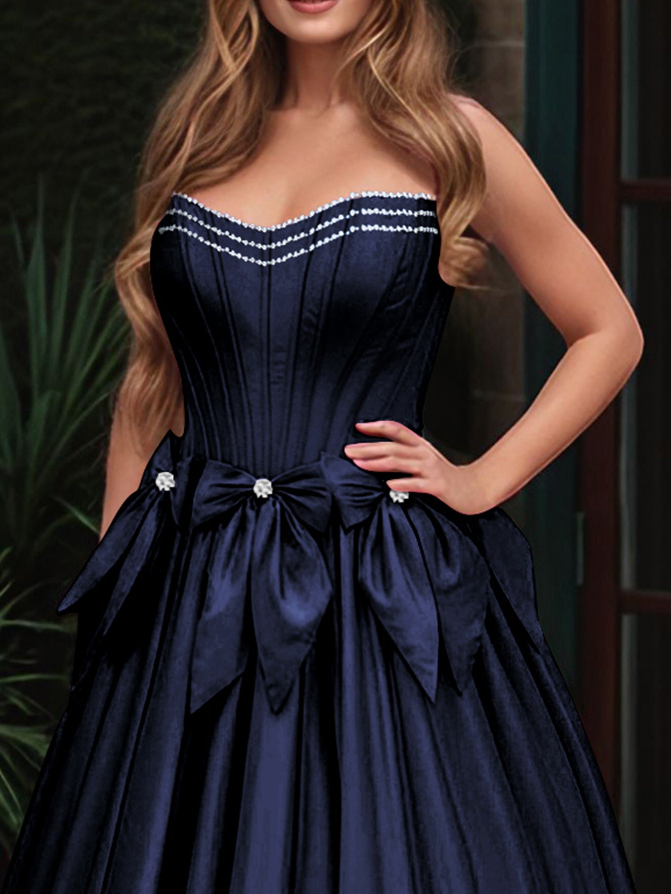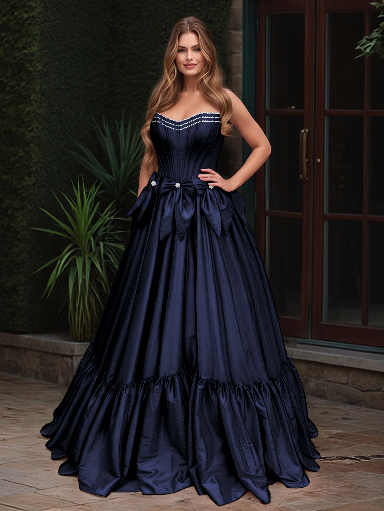 Boned Top Strapless Beaded Ball Gown Prom Dress With Bow - Navy Blue
