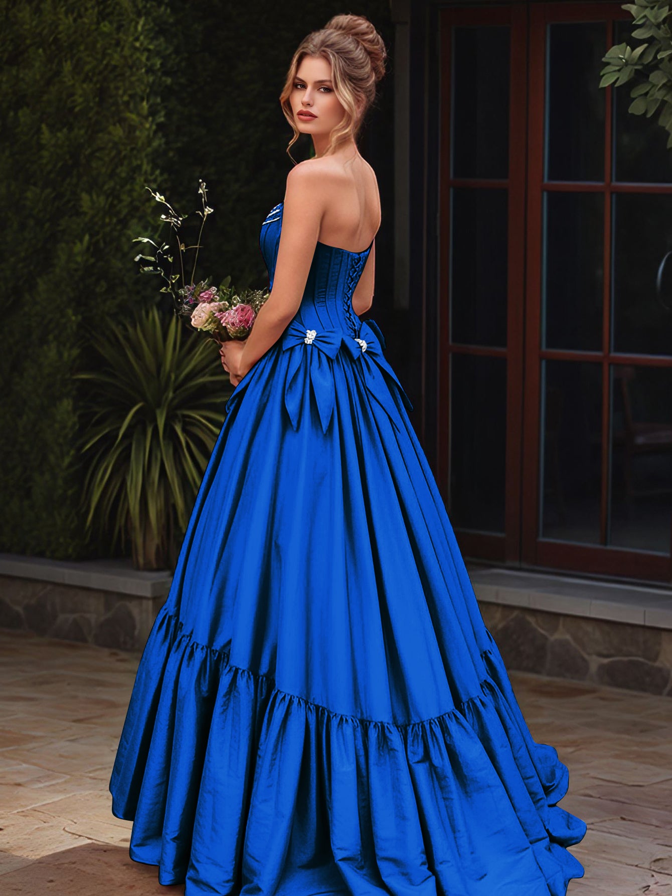 Boned Top Strapless Beaded Ball Gown Prom Dress With Bow - Royal Blue