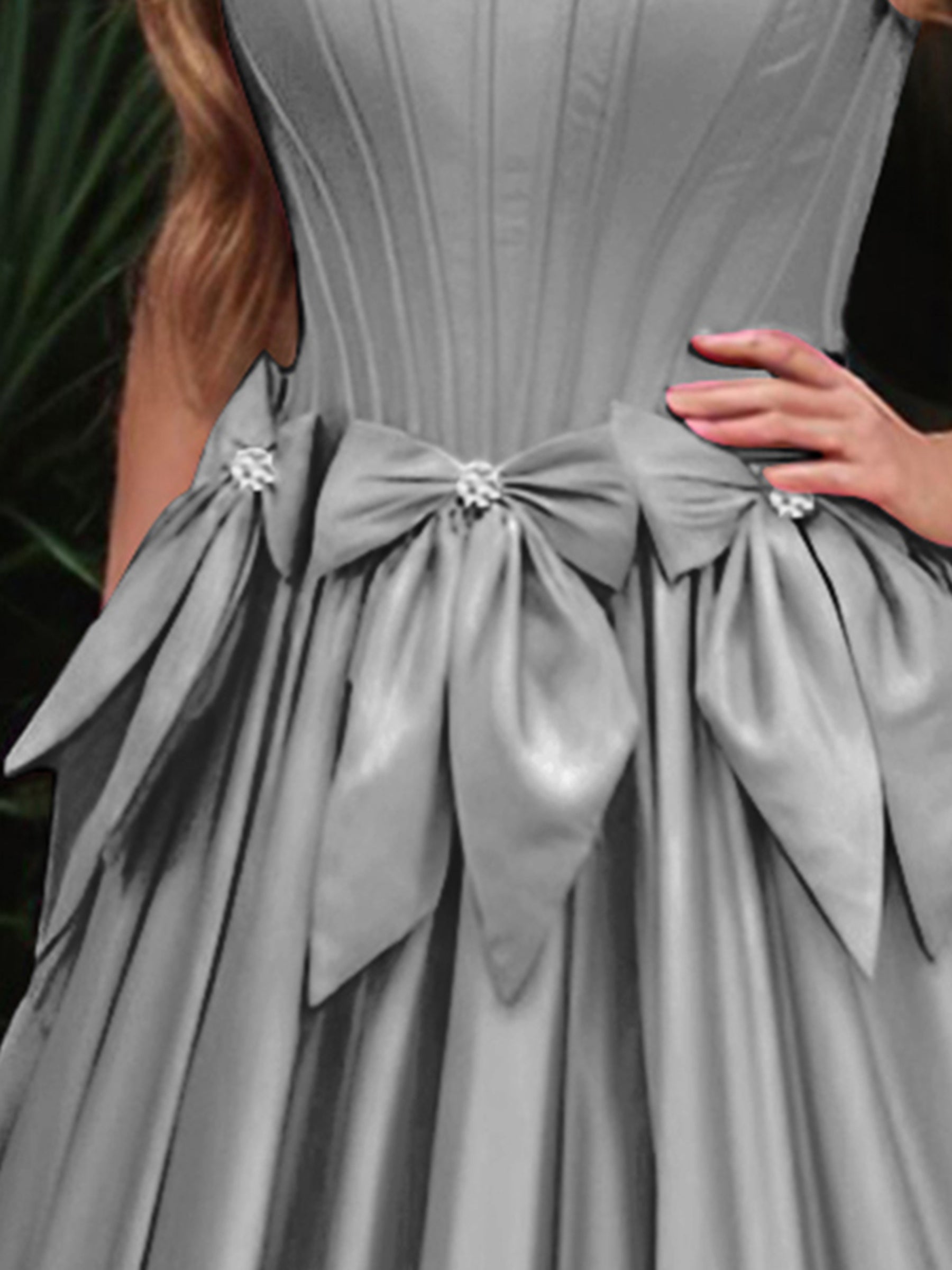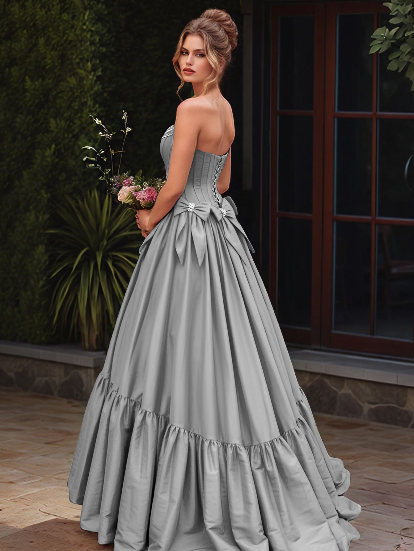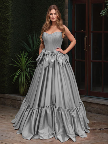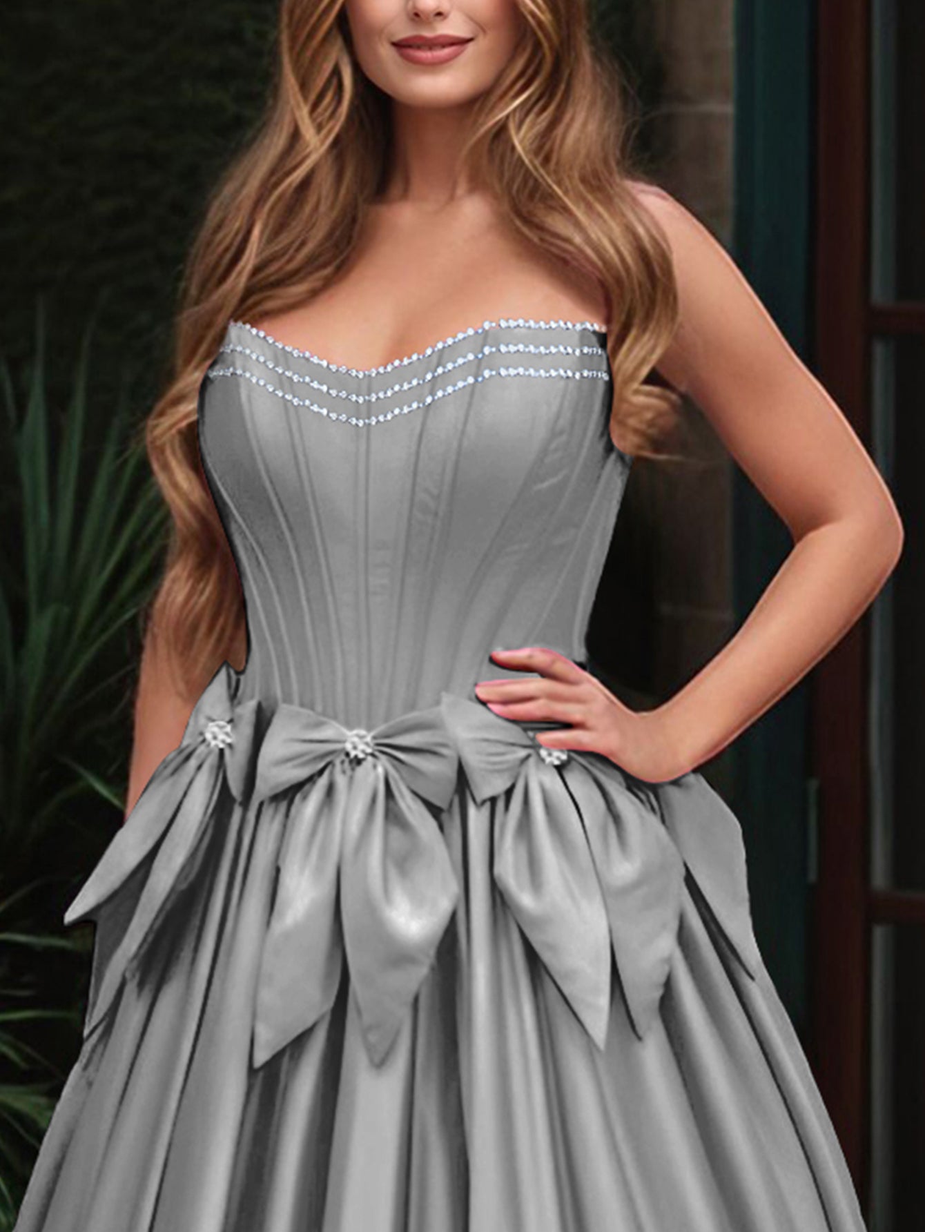 Boned Top Strapless Beaded Ball Gown Prom Dress With Bow - Silver