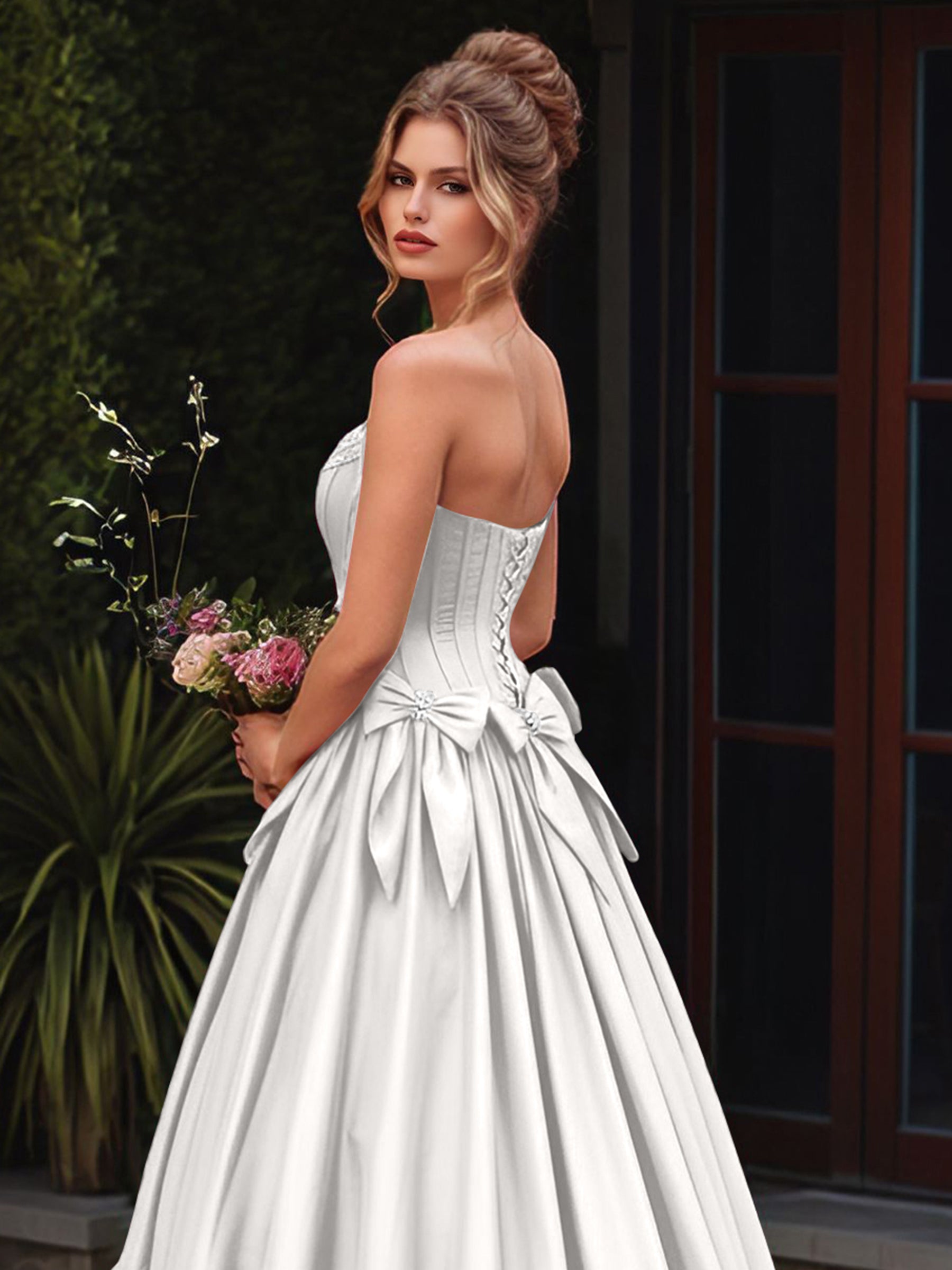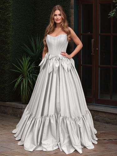 Boned Top Strapless Beaded Ball Gown Prom Dress With Bow - White