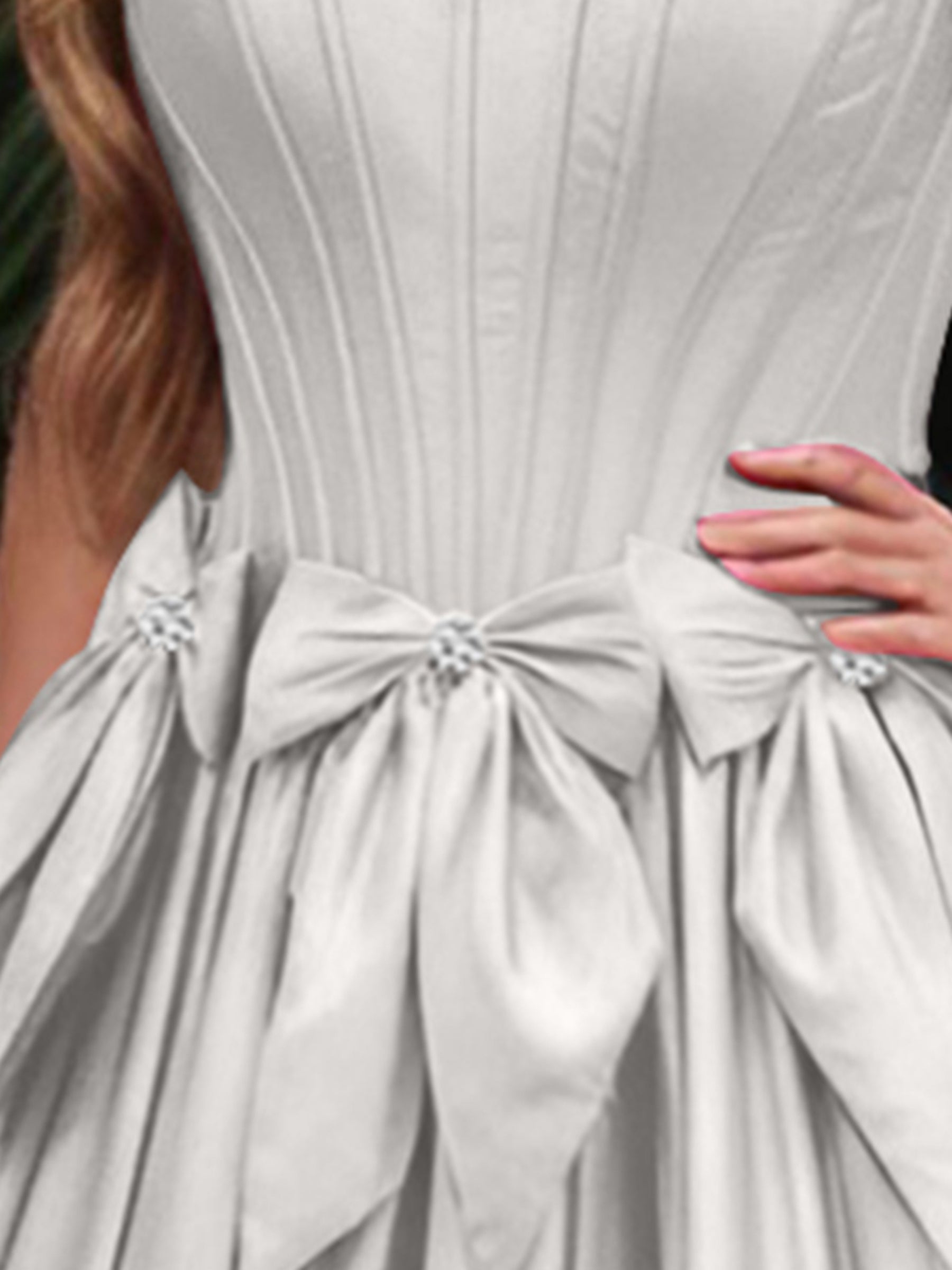 Details: Backless, Bow, Ruffle Hem, Crystal