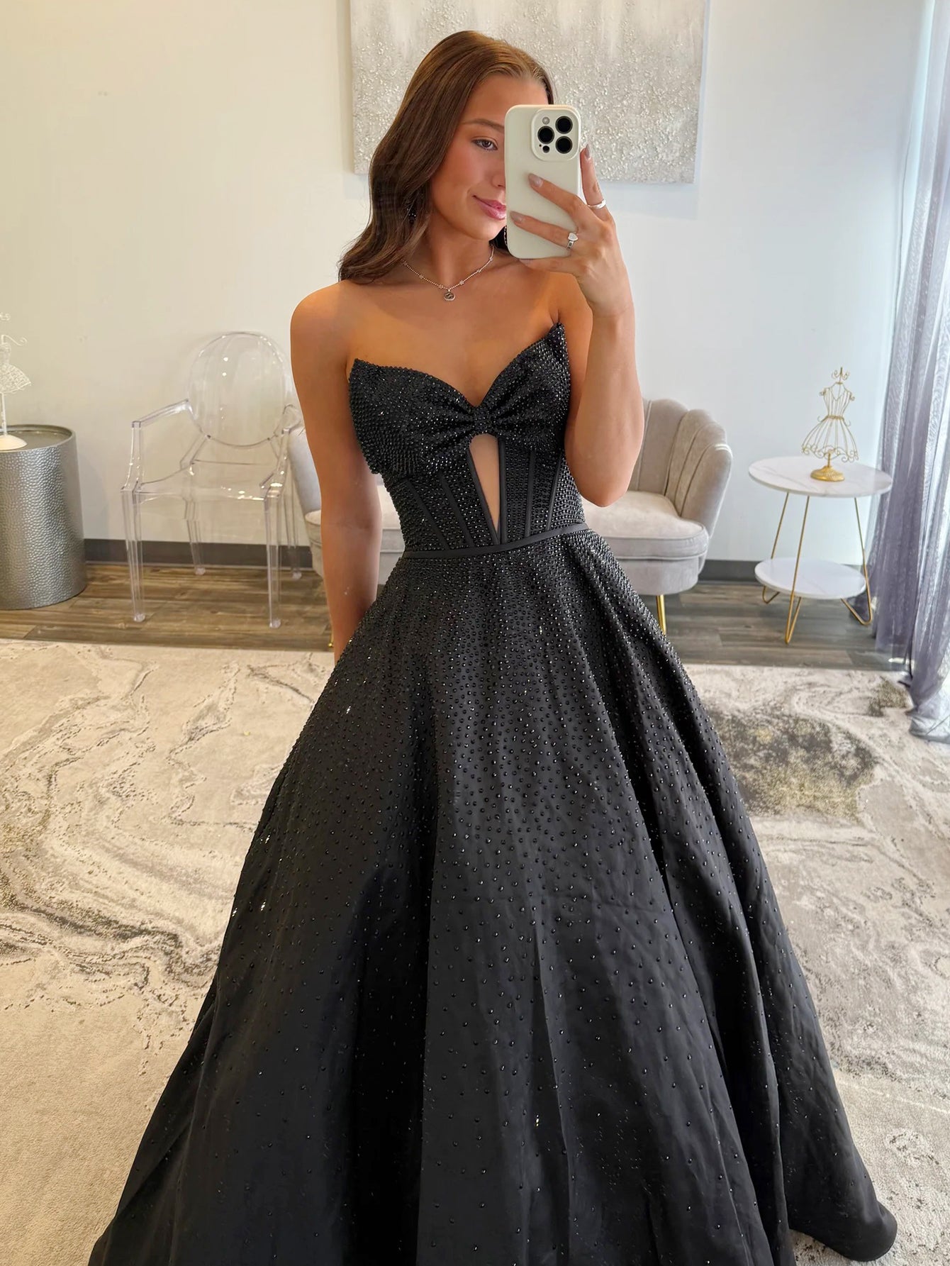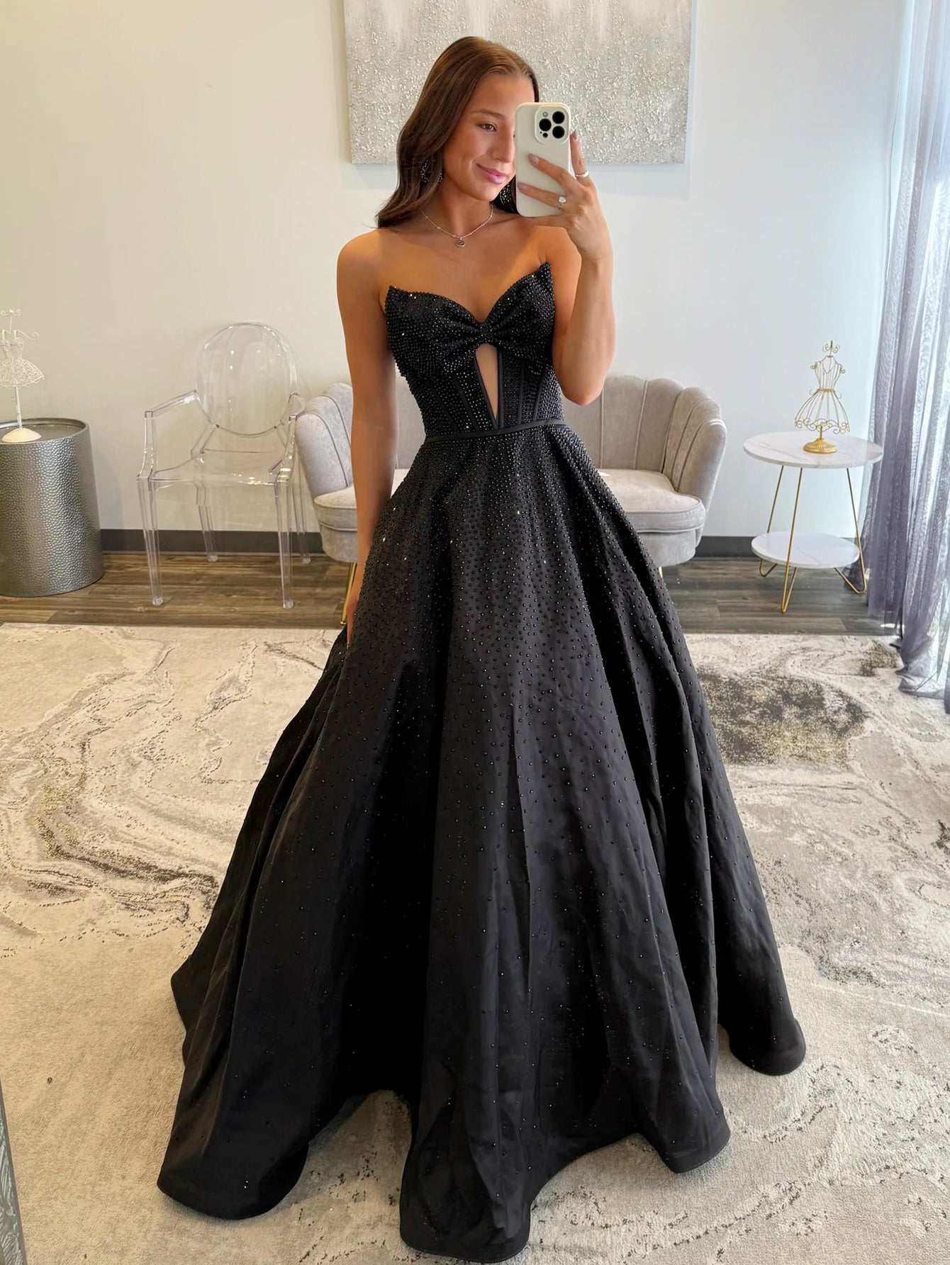 Bow Cut Front Bodice Crystal Ball Gown Prom Dress With Pockets - Black