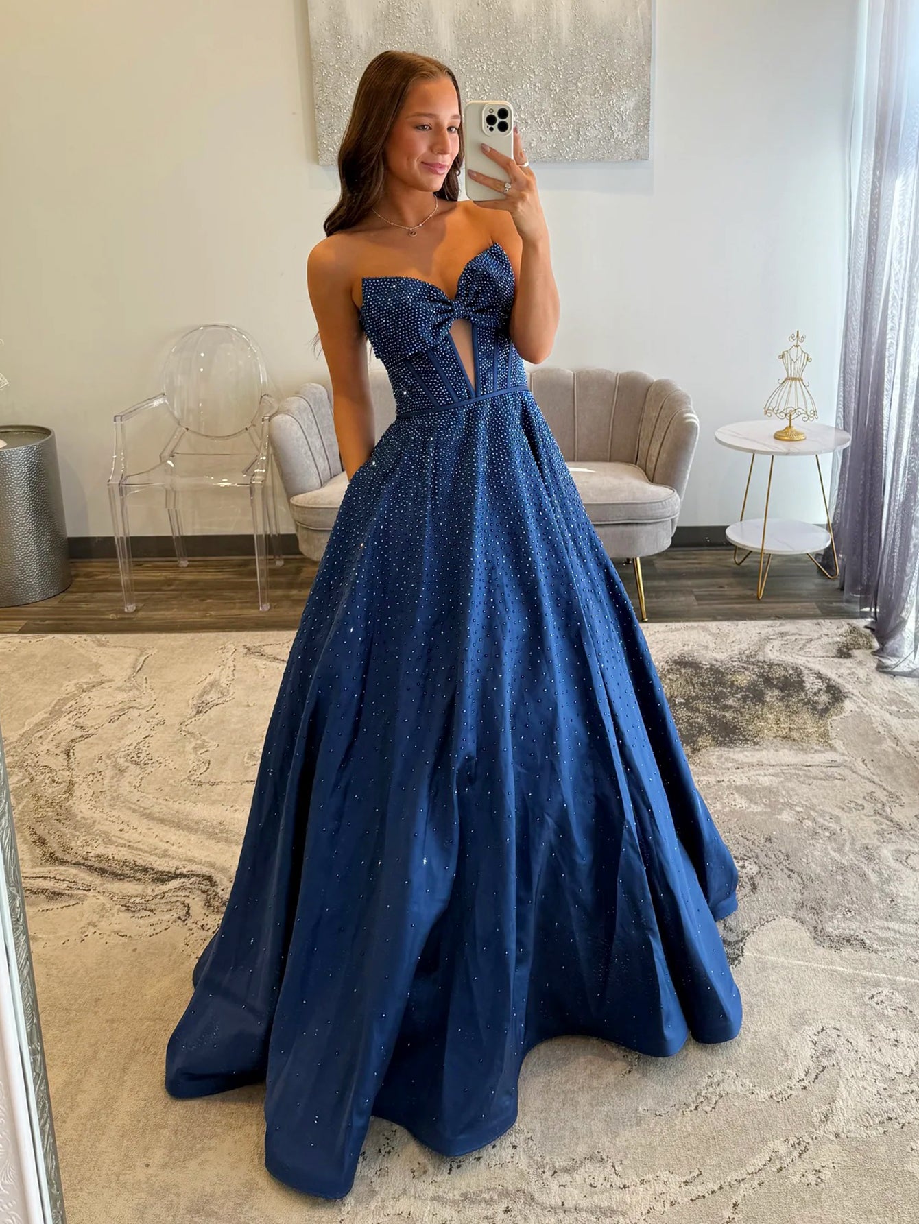 Bow Cut Front Bodice Crystal Ball Gown Prom Dress With Pockets - Dark Blue