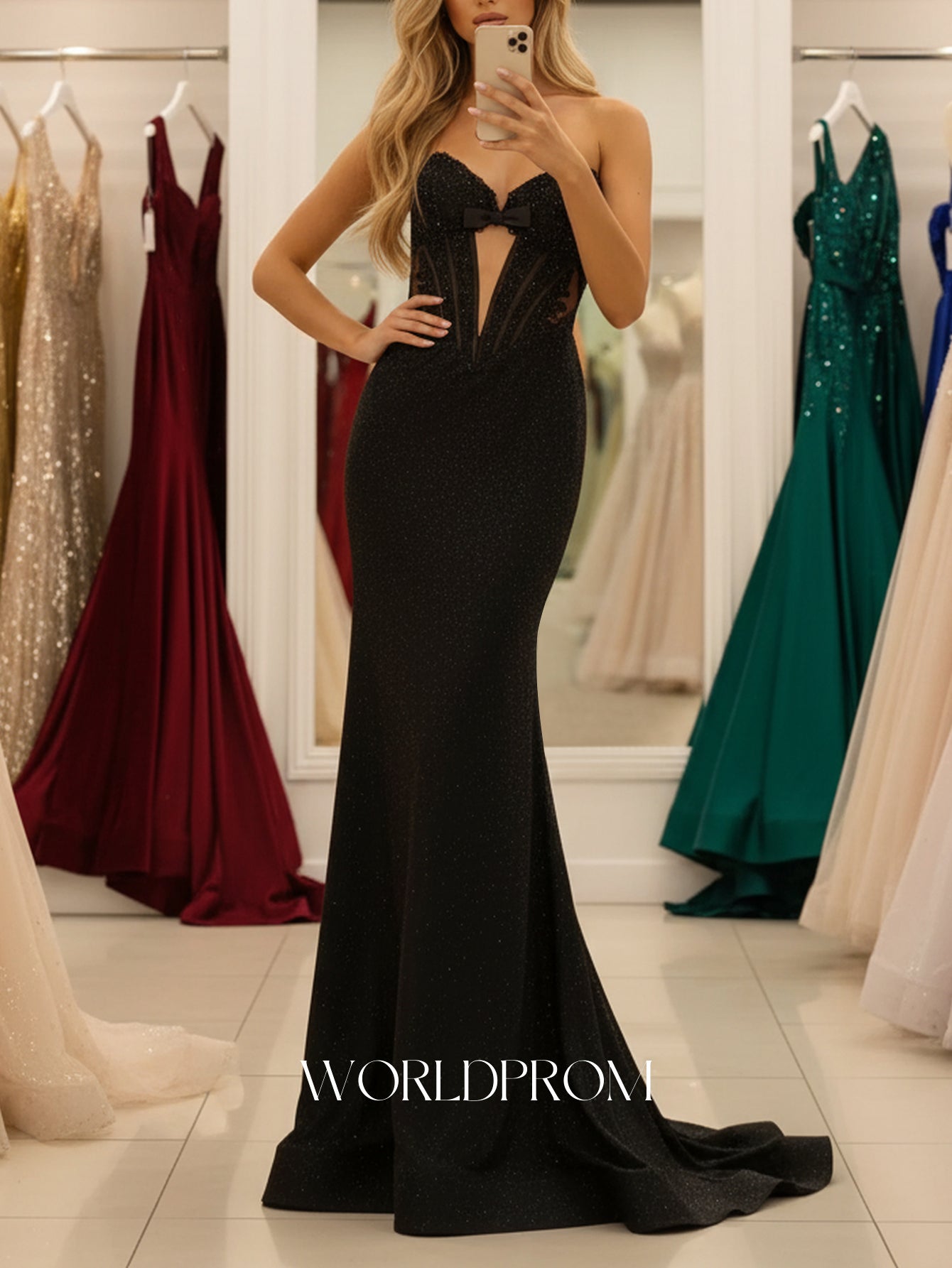 This satin prom gown features hot fix crystal with bow on the bodice. The strapless dress has a sweetheart neckline and sheath hem. Worldprom trumpet prom dresses are ideal for party, evening or festivals.
