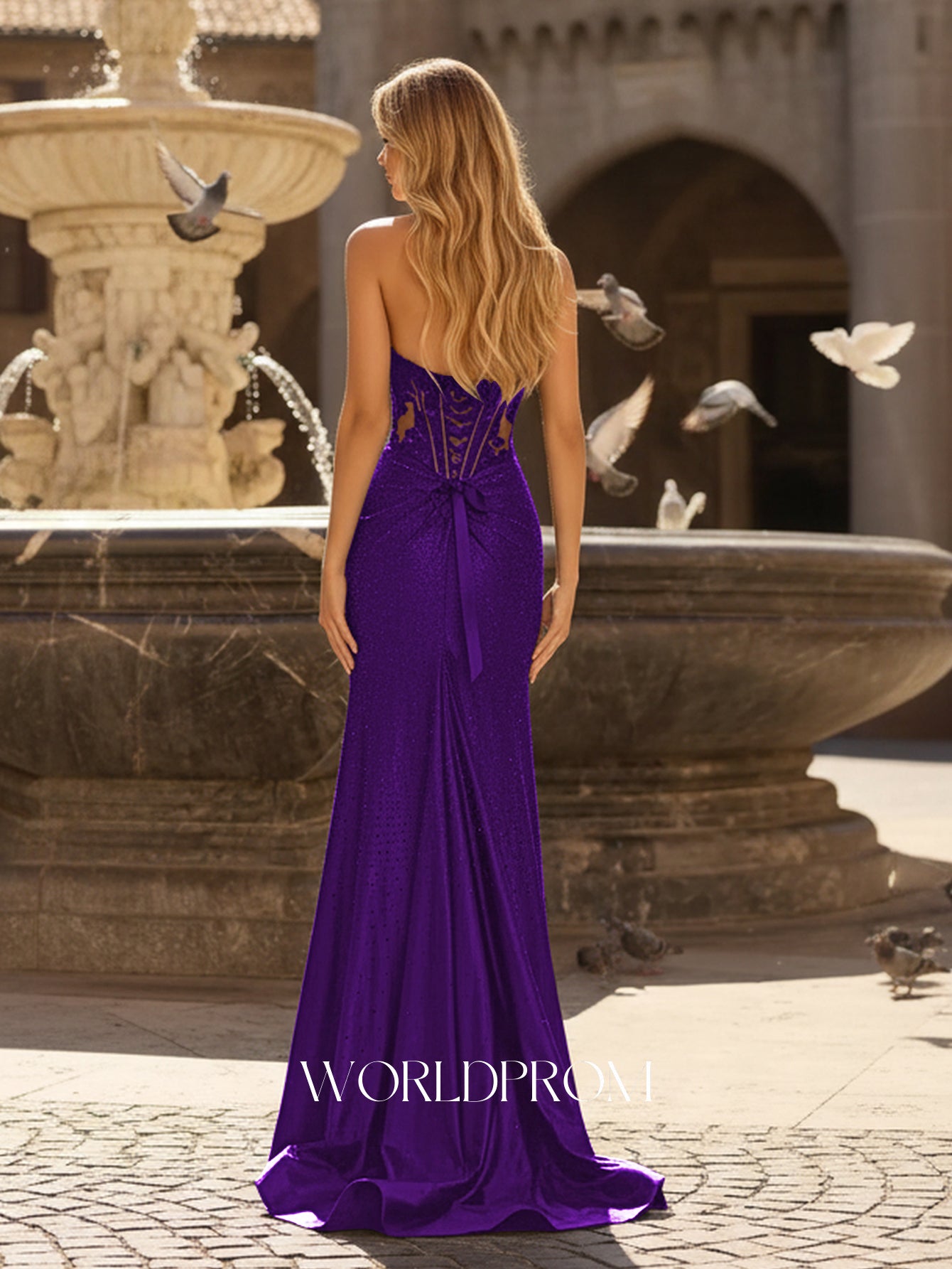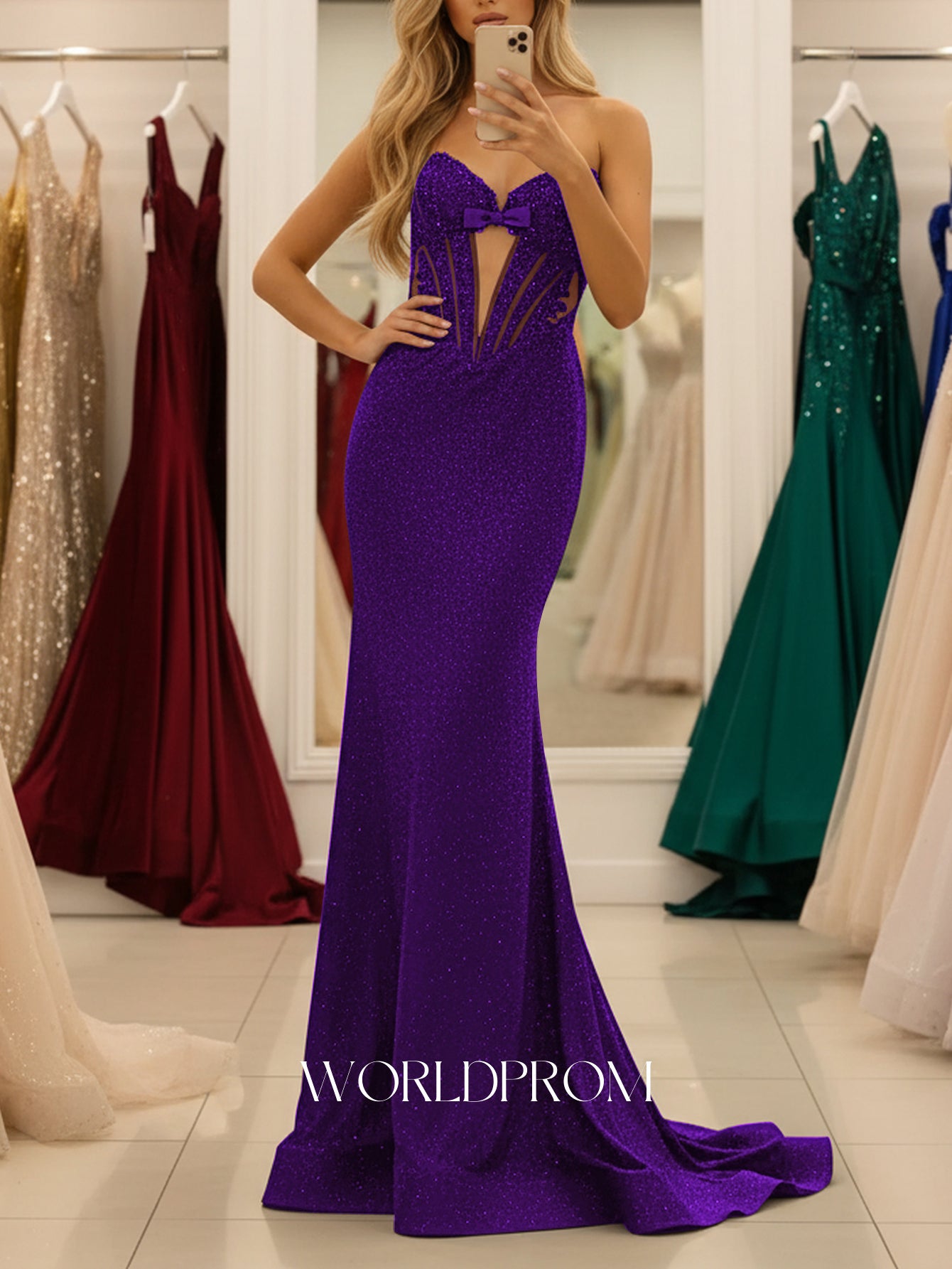This satin prom gown features hot fix crystal with bow on the bodice. The strapless dress has a sweetheart neckline and sheath hem. Worldprom trumpet prom dresses are ideal for party, evening or festivals.