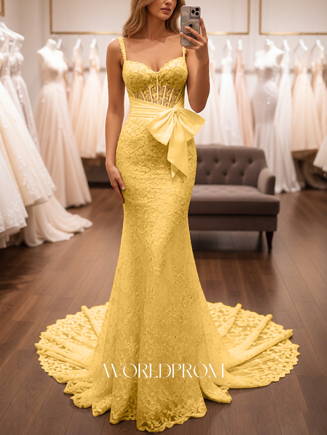 This lace prom gown features embroidery with bow front on the illusion bodice. The backless dress has a sweetheart neckline and lace up back. Worldprom mermaid prom dresses are ideal for party, evening or festivals.
