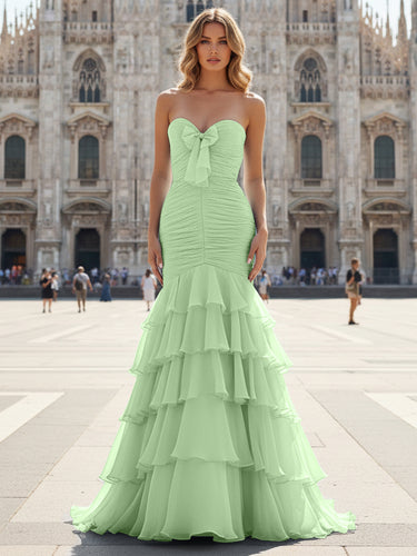 This chiffon prom gown features ruched bust with bow front on the bodice. The strapless dress has a sweetheart neckline and ruffled hem. Worldprom mermaid prom dresses are ideal for party, evening or festivals.