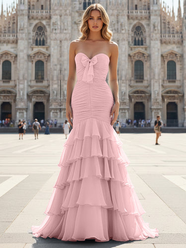 Bow Front Pleated Layered Ruffle Hem Mermaid Long Prom Dress - Pink