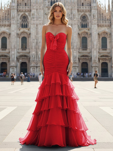 Bow Front Pleated Layered Ruffle Hem Mermaid Long Prom Dress - Red