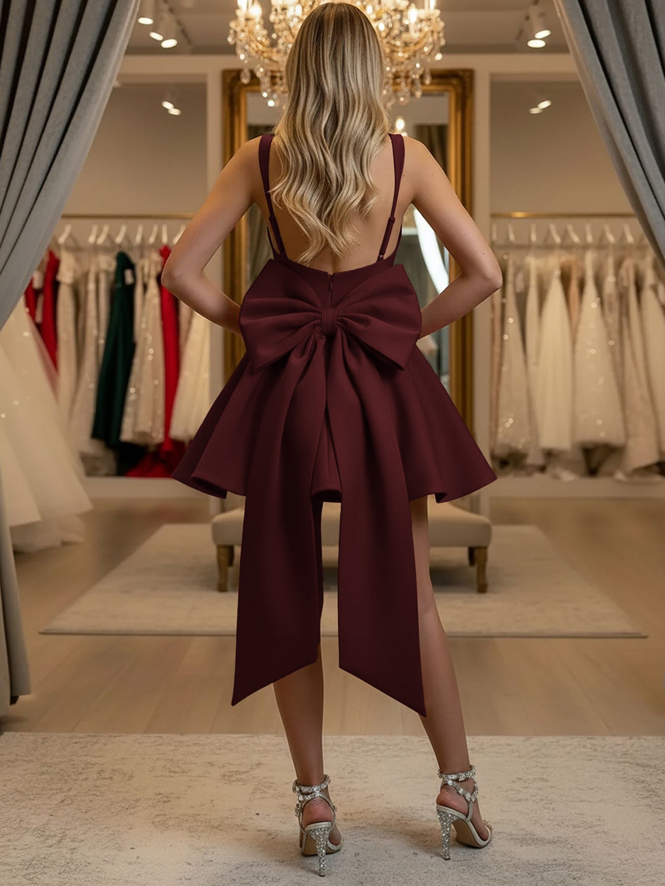 Details: Backless, Fitted Waist, Bow, Pleats