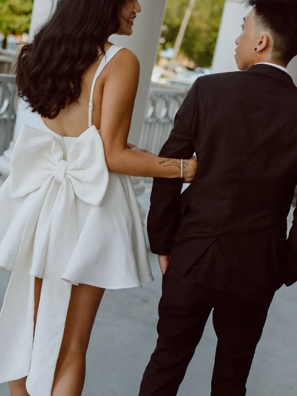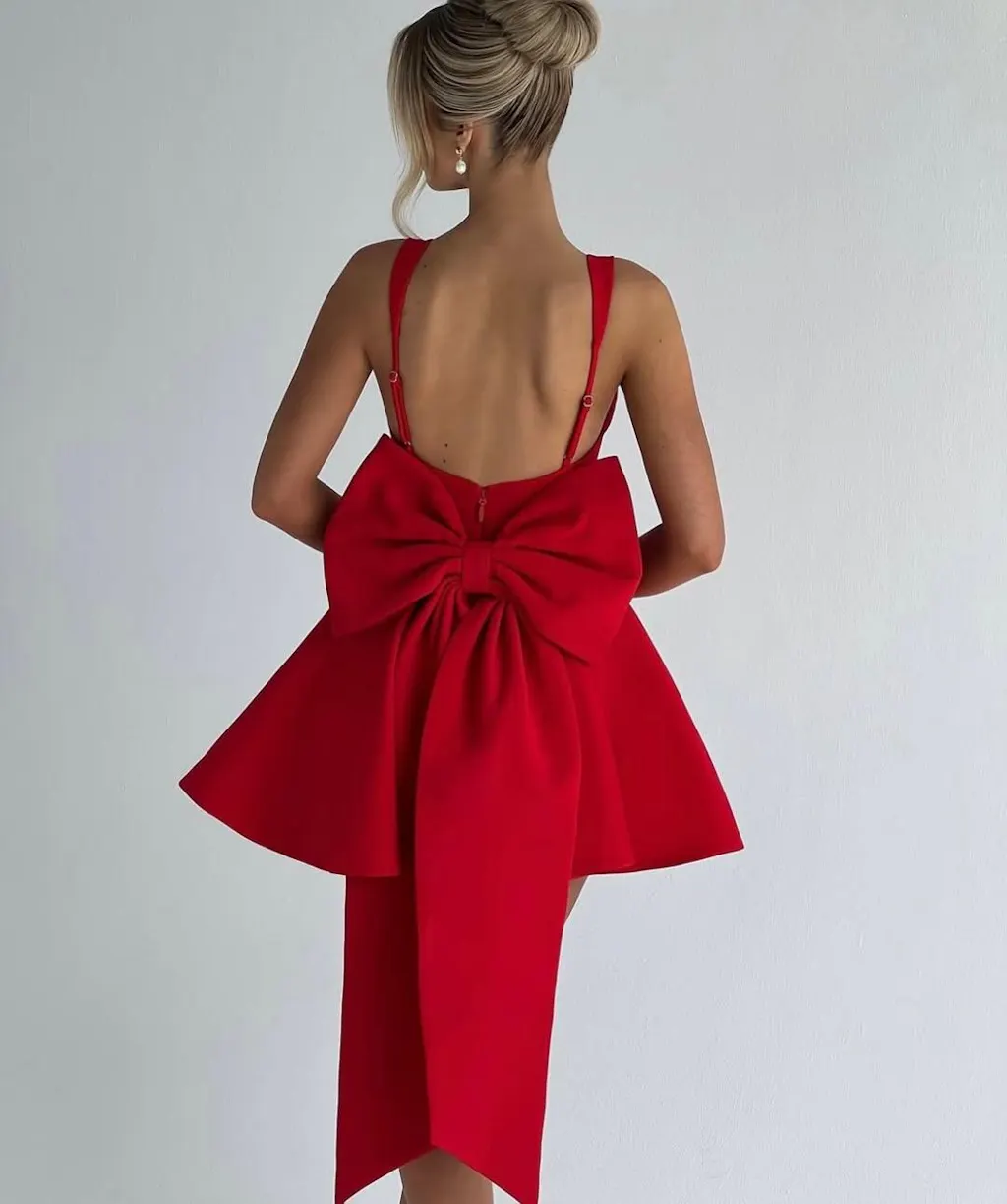 Details: Backless, Fitted Waist, Bow, Pleats