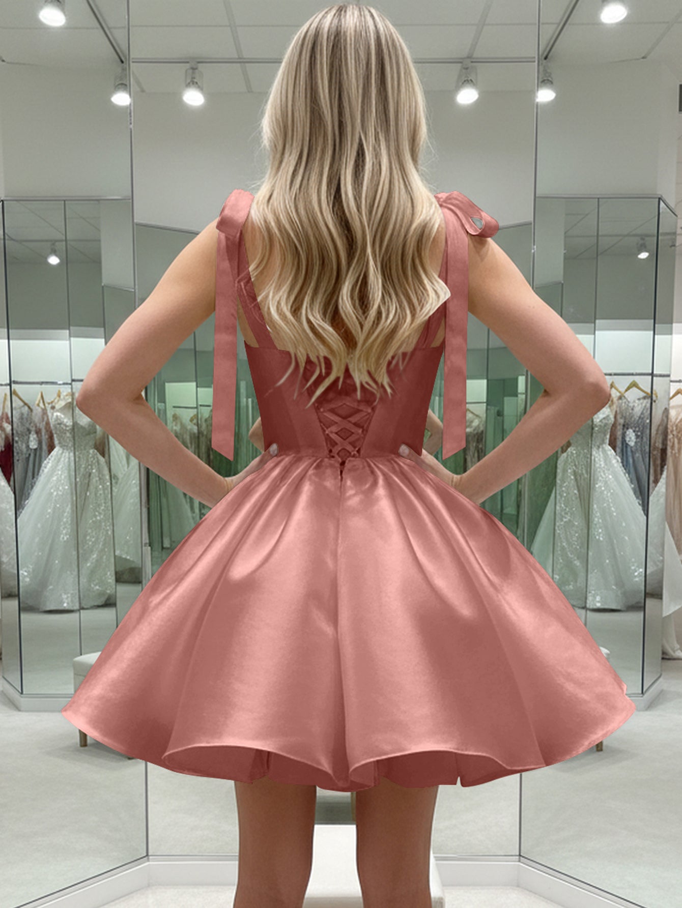 Bow Shoulder Corset Lace Up Satin Mini Ball Gown Prom Dress - Dusty Rose