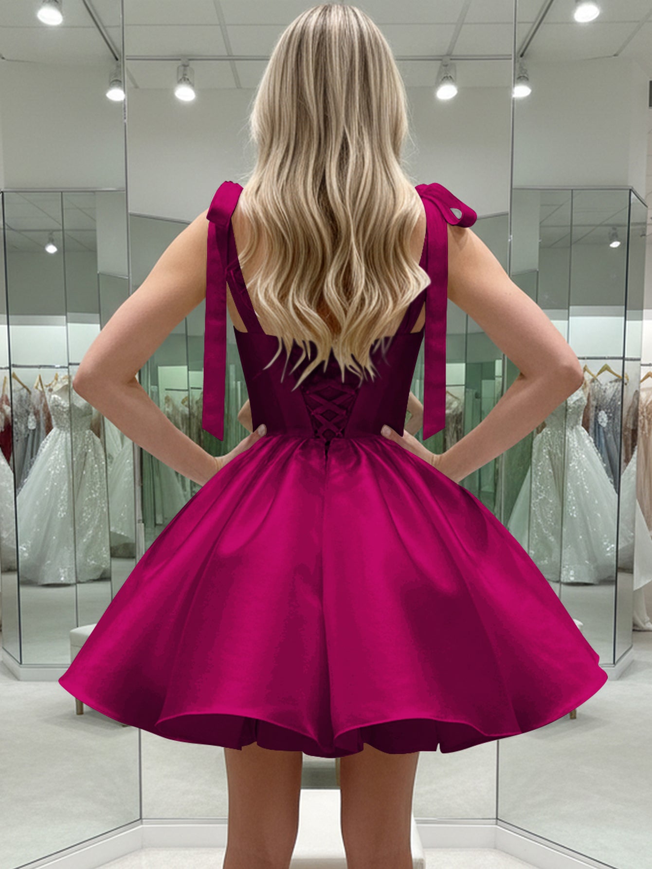 Bow Shoulder Corset Lace Up Satin Mini Ball Gown Prom Dress - Fuchsia