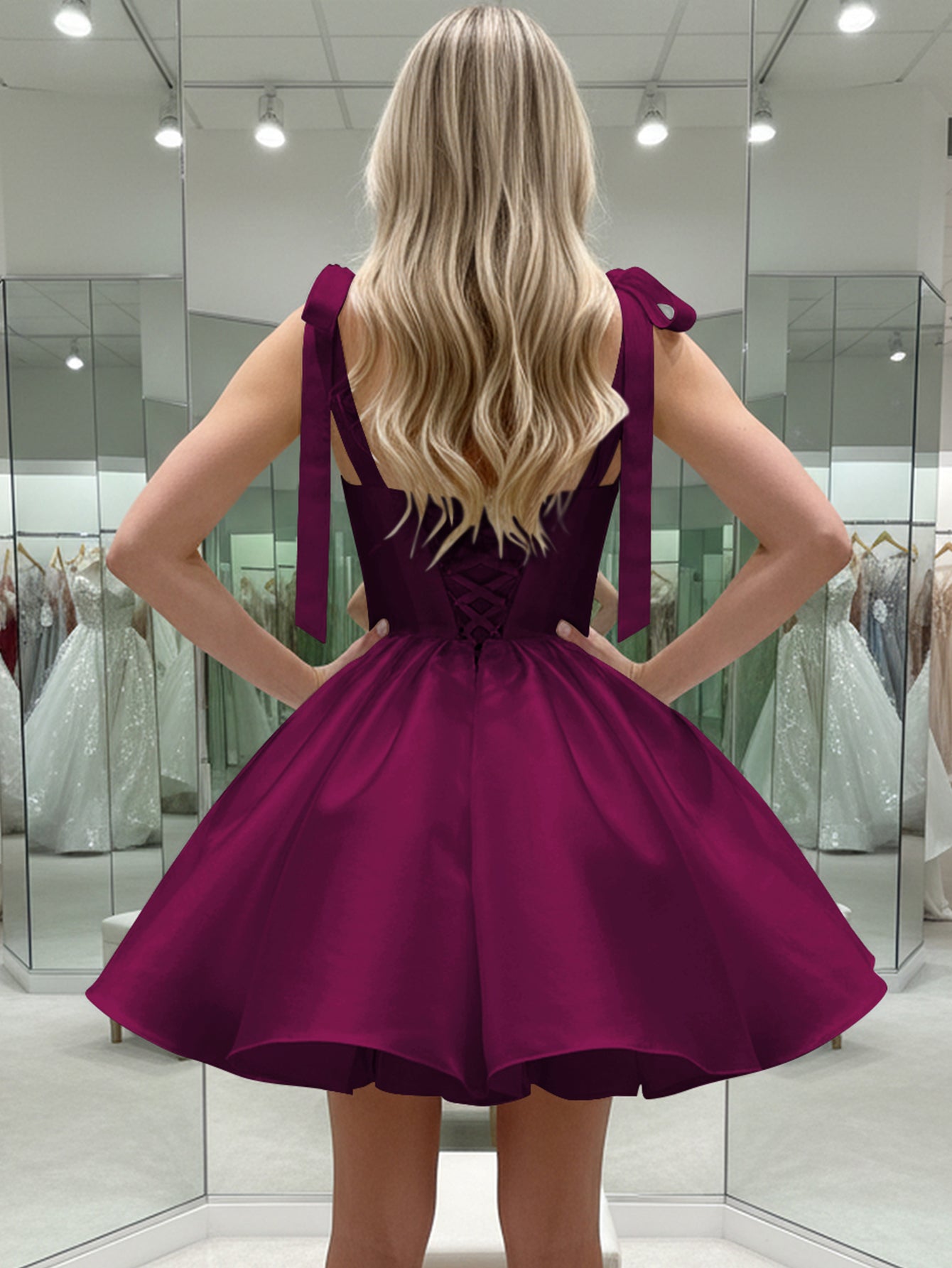 Bow Shoulder Corset Lace Up Satin Mini Ball Gown Prom Dress - Grape