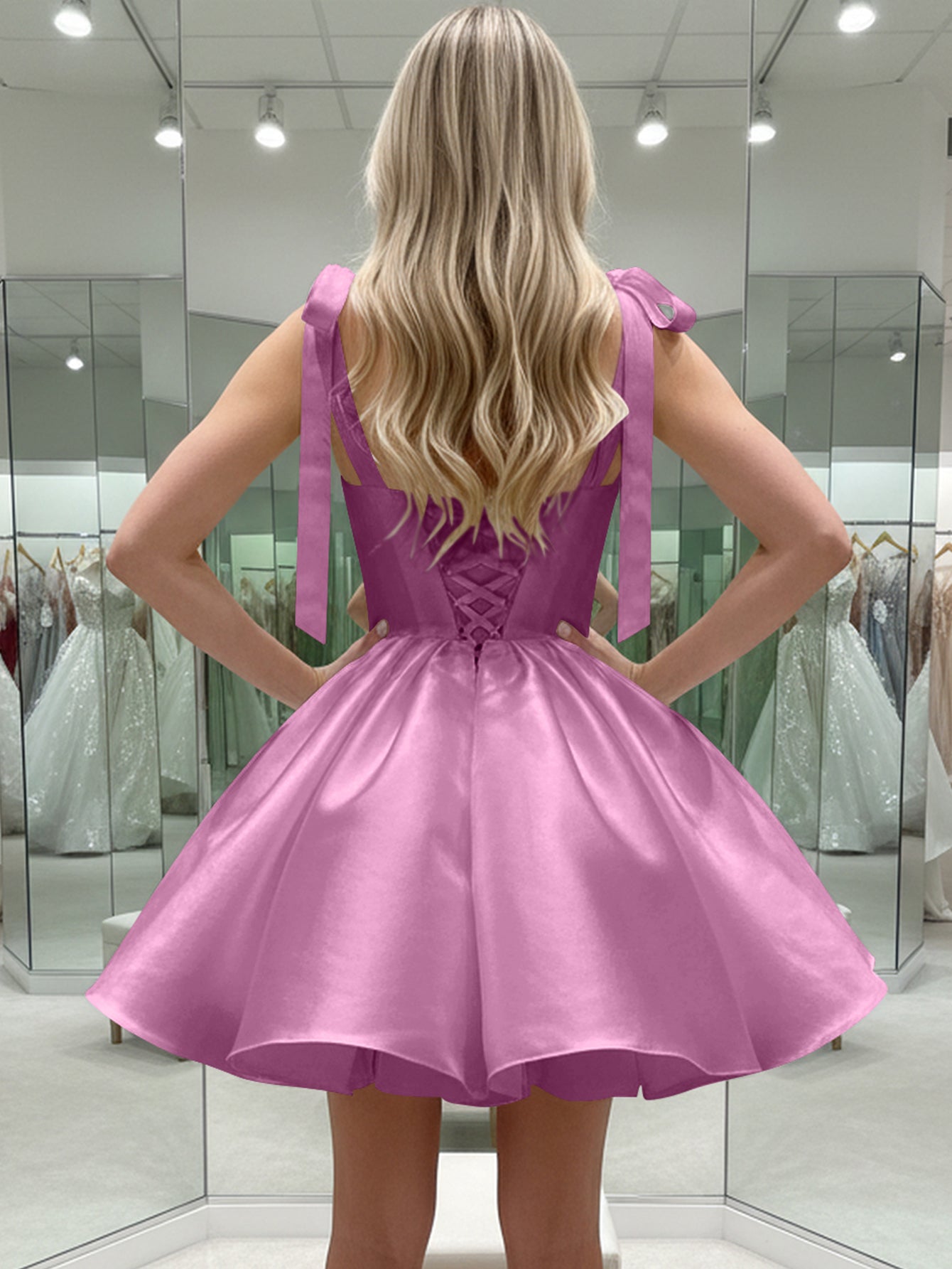 Bow Shoulder Corset Lace Up Satin Mini Ball Gown Prom Dress - Lilac