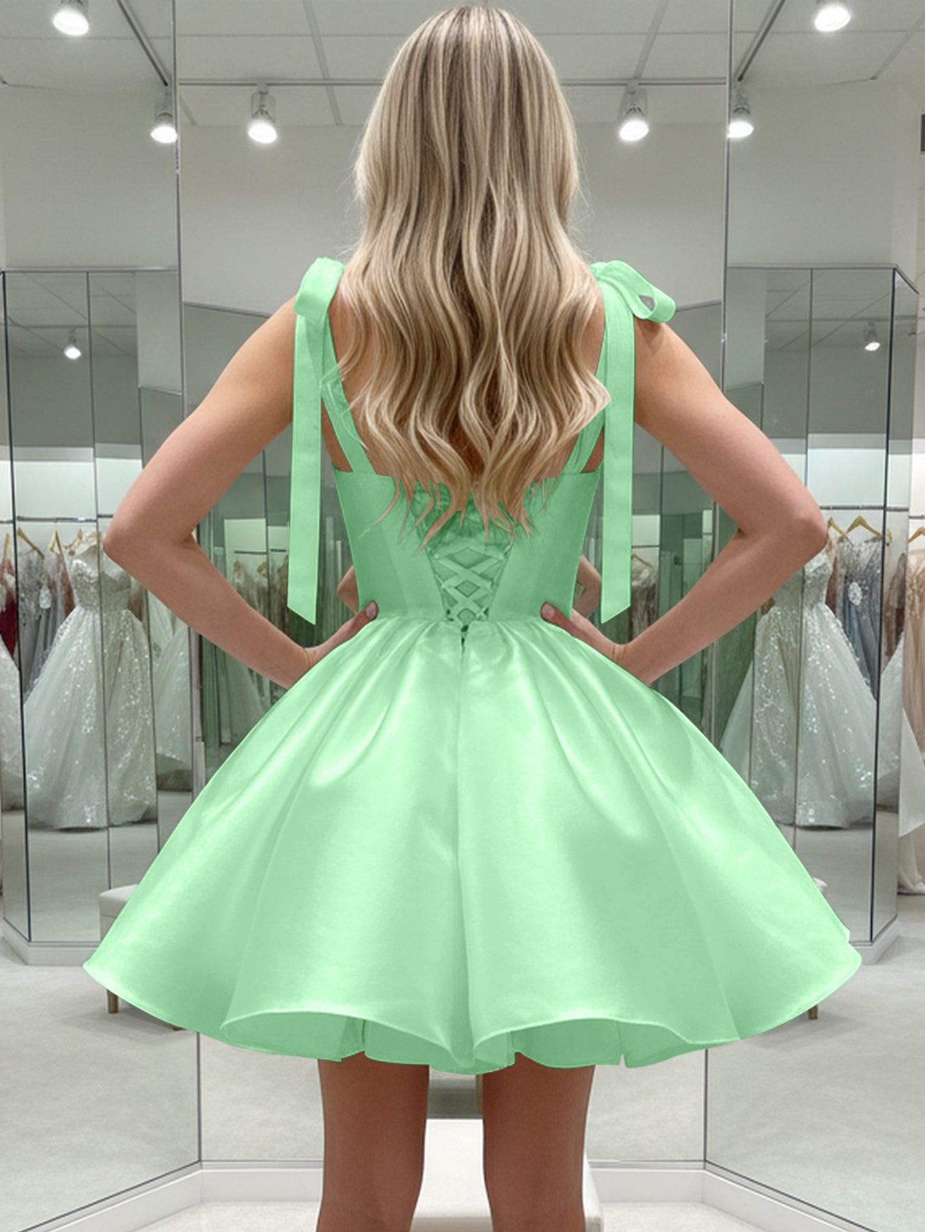 Bow Shoulder Corset Lace Up Satin Mini Ball Gown Prom Dress - Mint Green