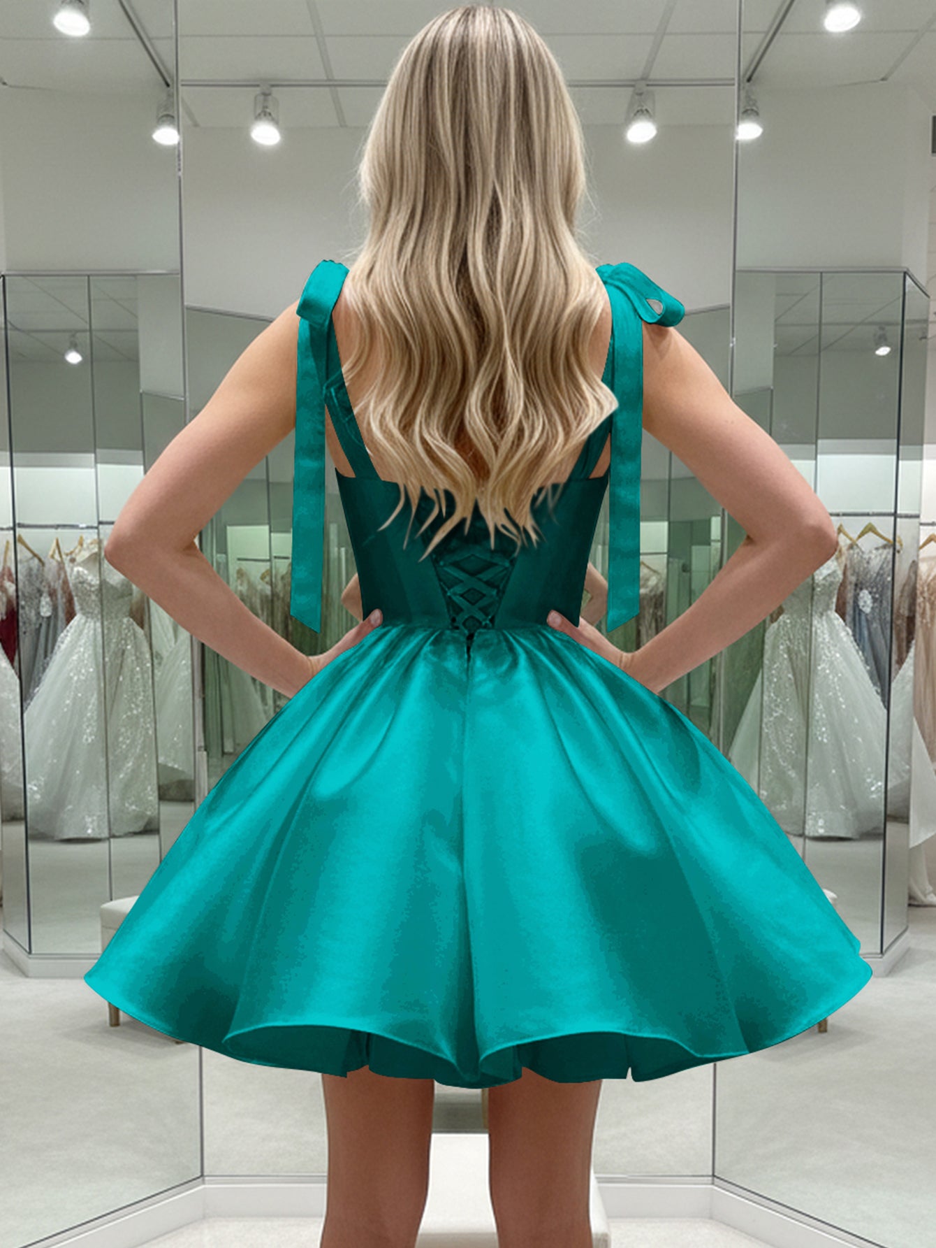 Bow Shoulder Corset Lace Up Satin Mini Ball Gown Prom Dress - Turquoise