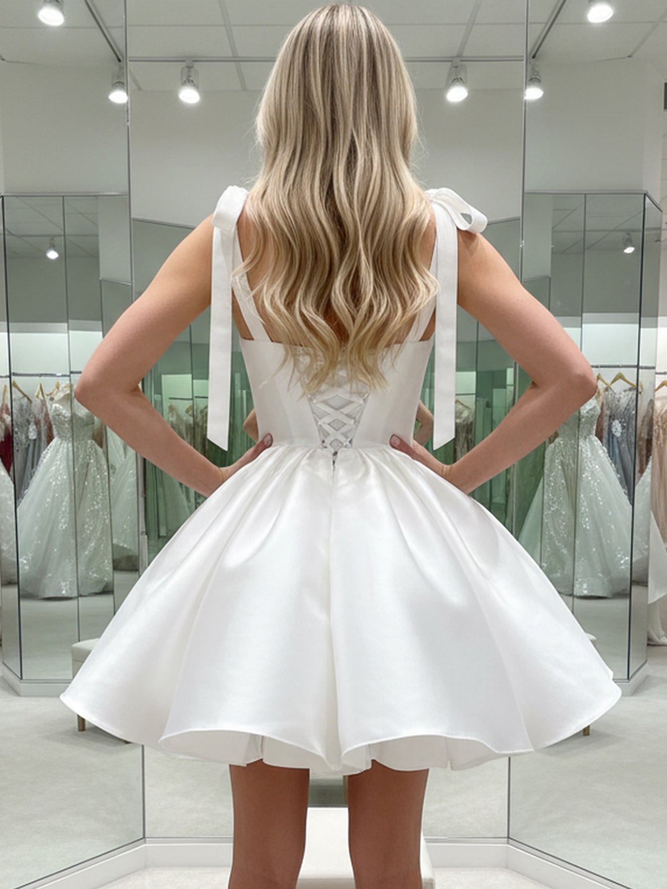 Bow Shoulder Corset Lace Up Satin Mini Ball Gown Prom Dress - White