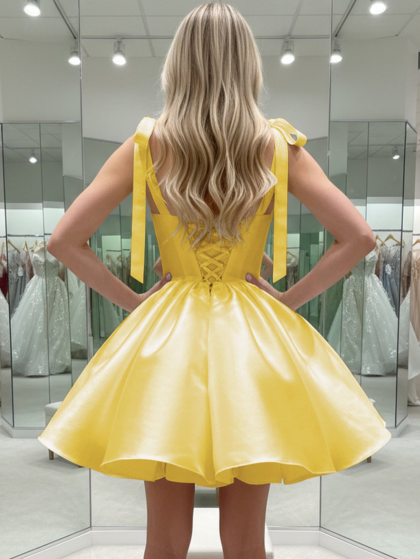 Bow Shoulder Corset Lace Up Satin Mini Ball Gown Prom Dress - Yellow