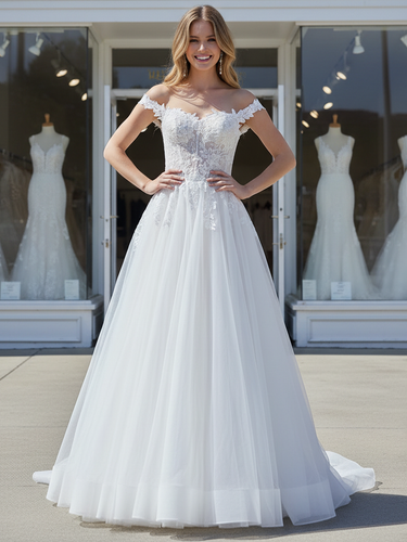 This vintage bridal dress features bodice with embroidery appliques and lace sheer net. The cap shoulder wedding shower dress has a scoop neck and chapel train. The ball gown wedding dress is ideal for beach, outdoor wedding or garden wedding guest party.