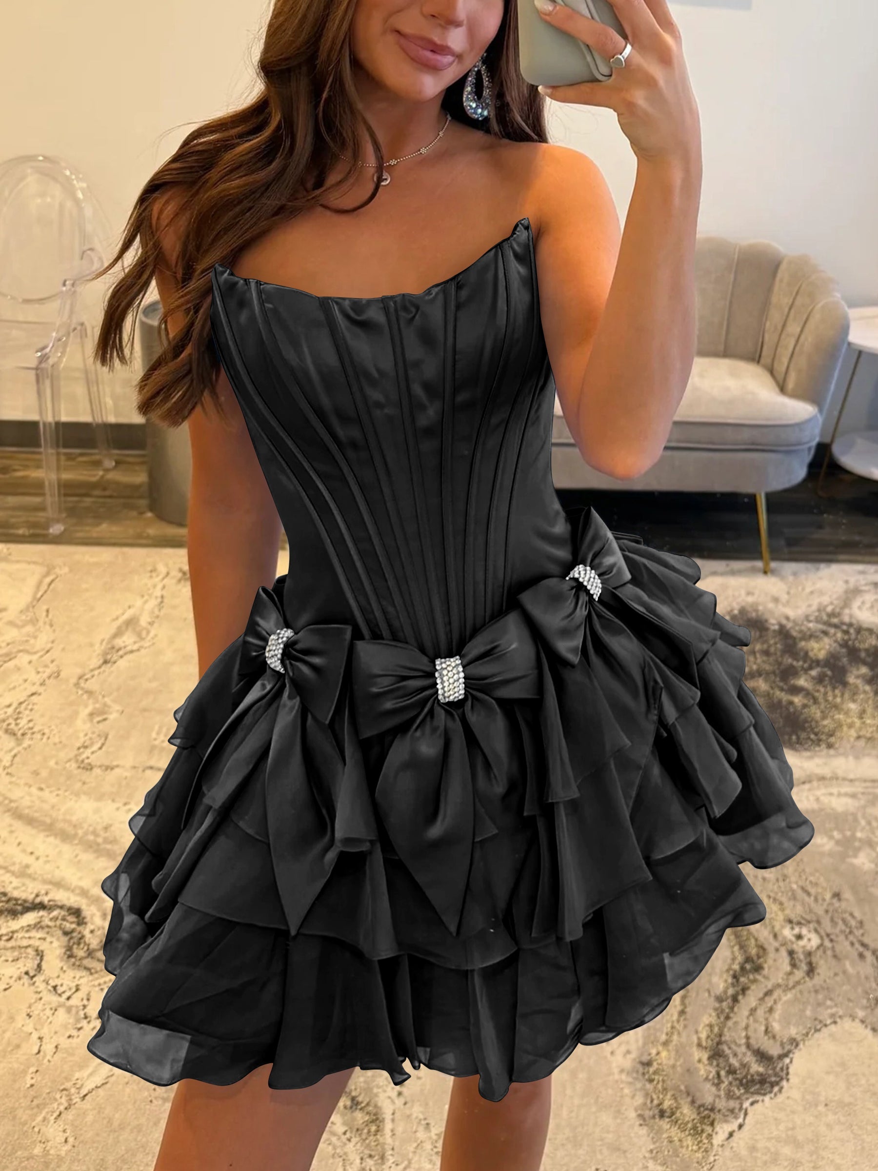 Crystal Boned Chiffon Bow Tiered Mini Ball Gown Prom Dress - Black