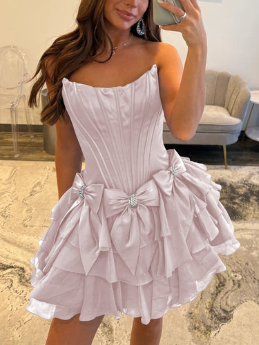 Crystal Boned Chiffon Bow Tiered Mini Ball Gown Prom Dress - Blush Pink