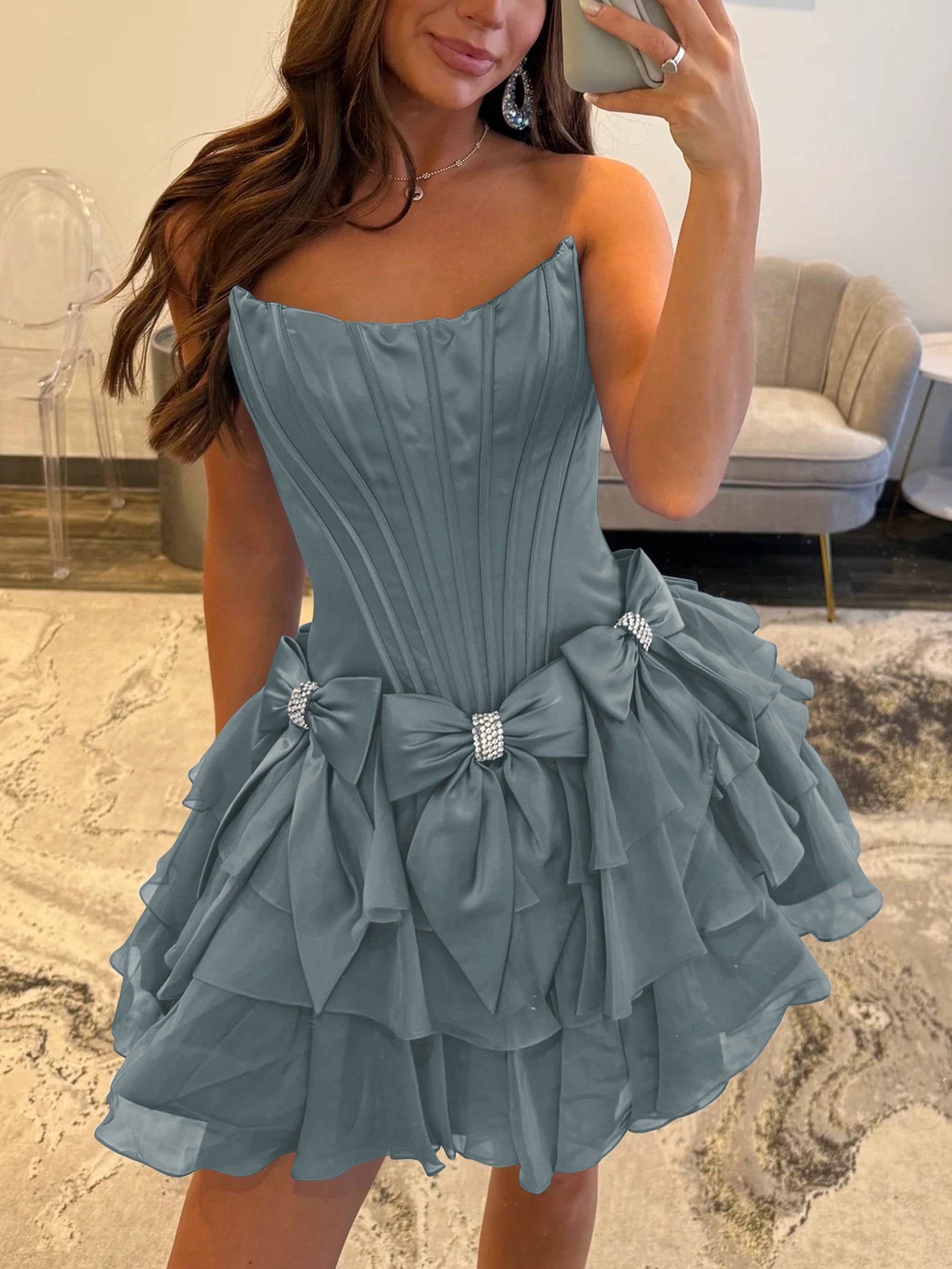 Crystal Boned Chiffon Bow Tiered Mini Ball Gown Prom Dress - Dusty Blue