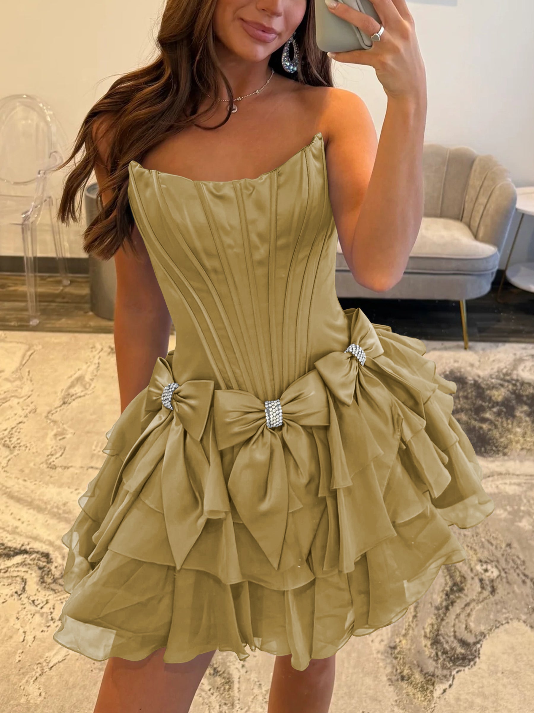 Crystal Boned Chiffon Bow Tiered Mini Ball Gown Prom Dress - Gold