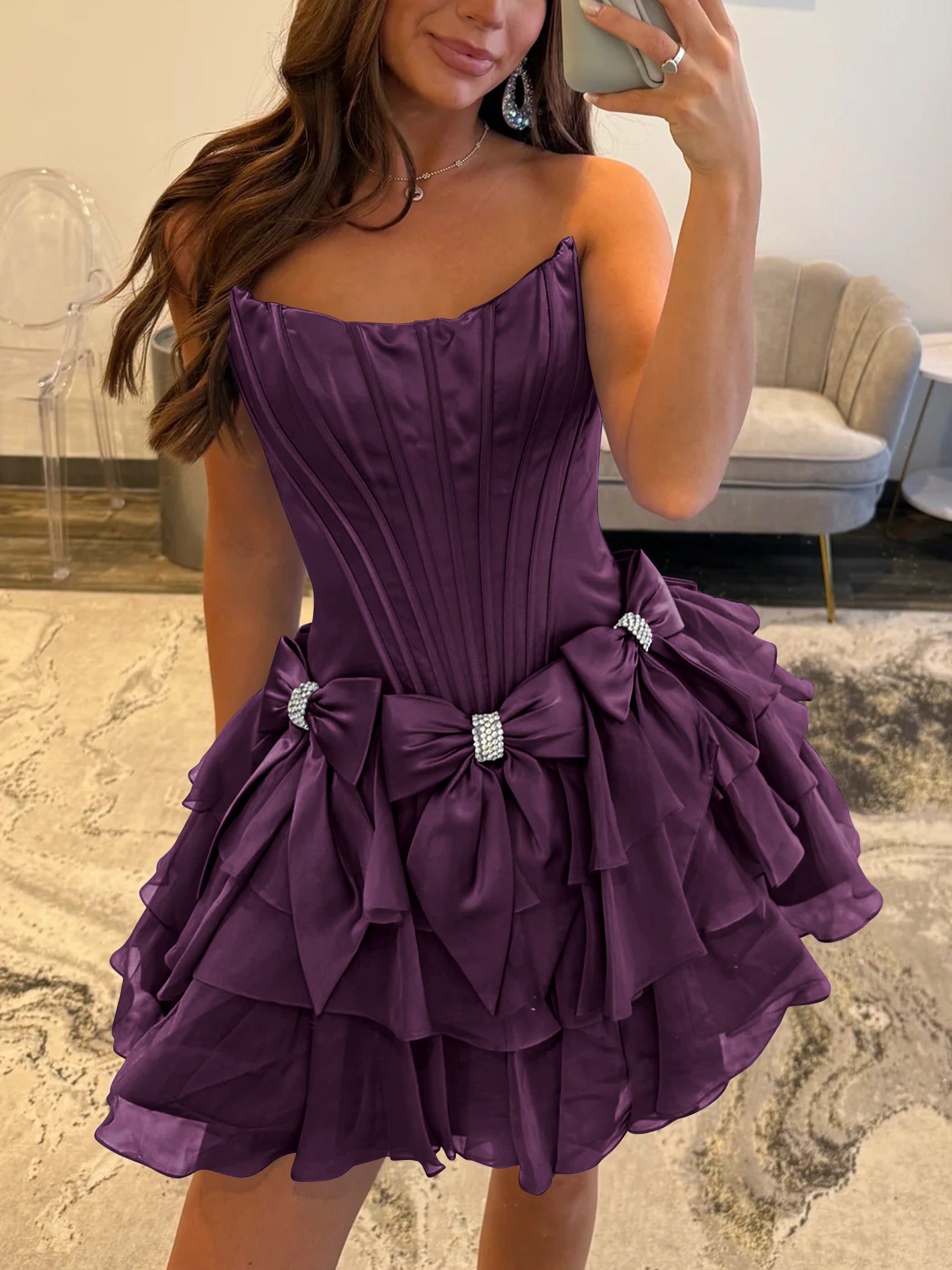 Crystal Boned Chiffon Bow Tiered Mini Ball Gown Prom Dress - Grape