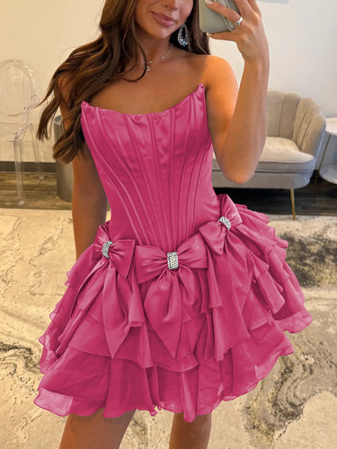 Crystal Boned Chiffon Bow Tiered Mini Ball Gown Prom Dress - Hot Pink