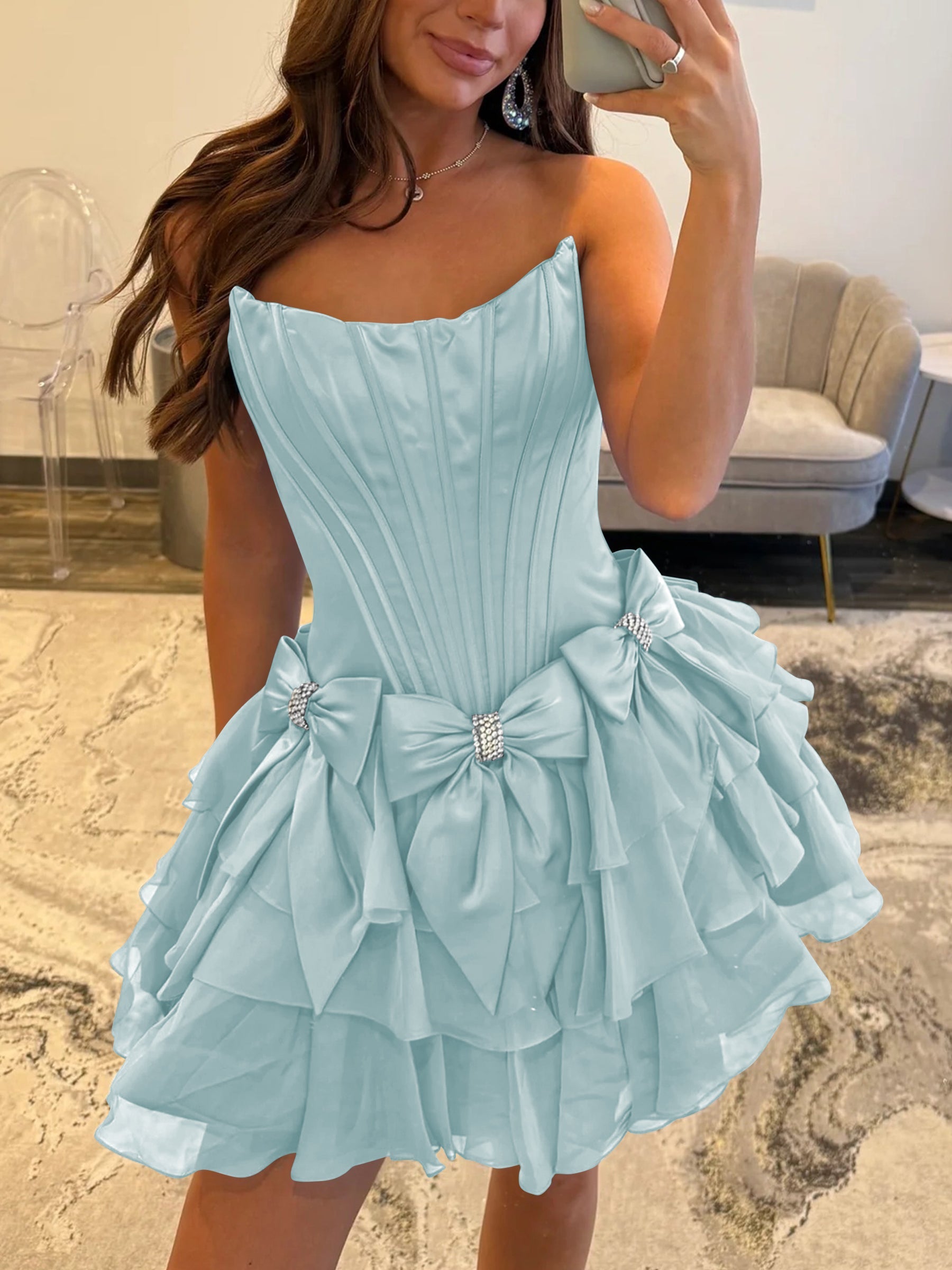 Crystal Boned Chiffon Bow Tiered Mini Ball Gown Prom Dress - Light Blue