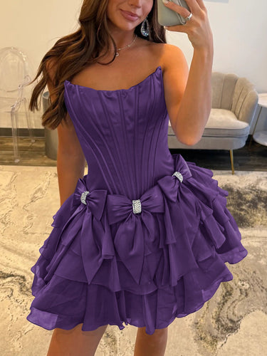 Crystal Boned Chiffon Bow Tiered Mini Ball Gown Prom Dress - Purple