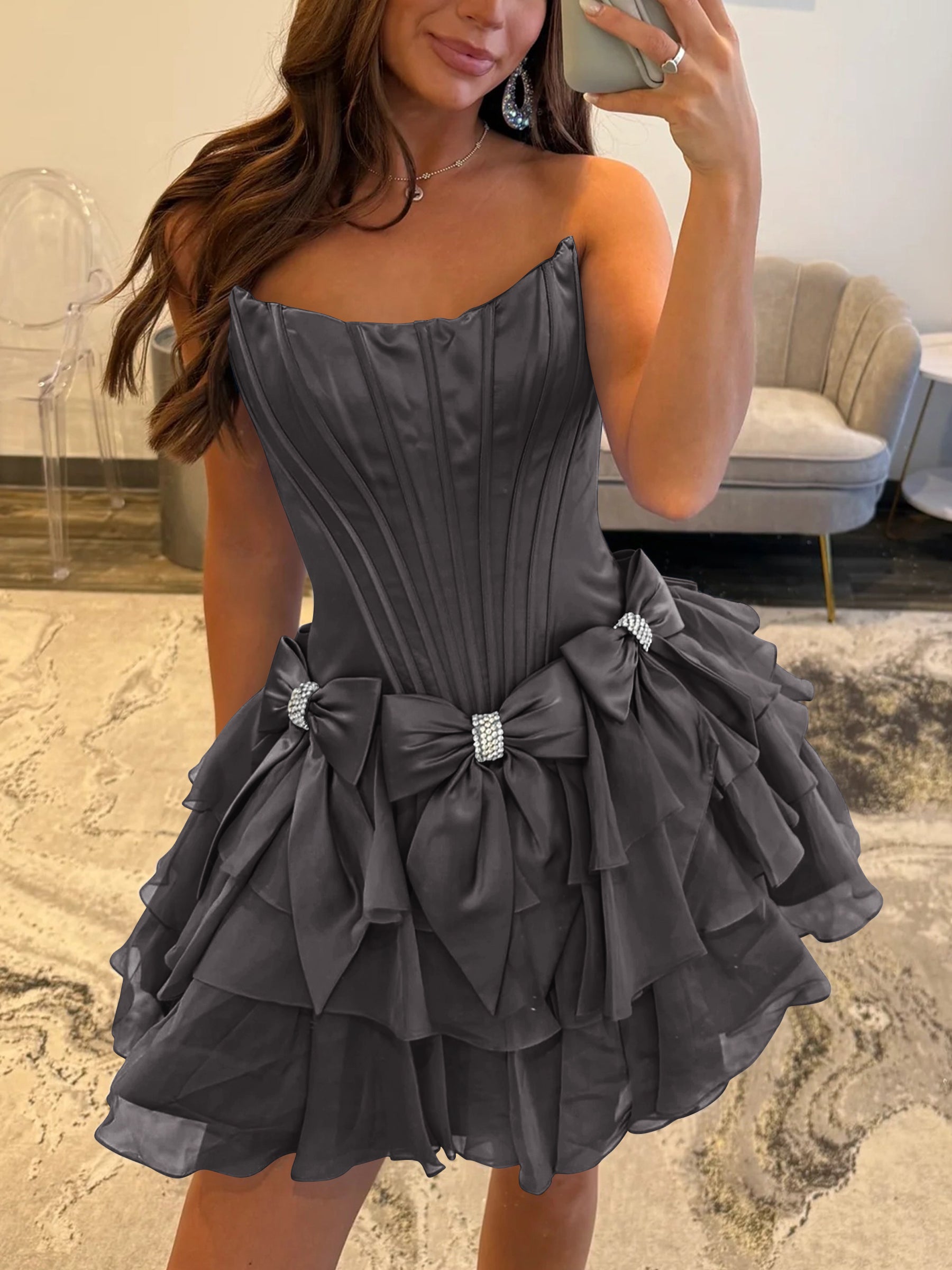 Crystal Boned Chiffon Bow Tiered Mini Ball Gown Prom Dress - Purple Grey