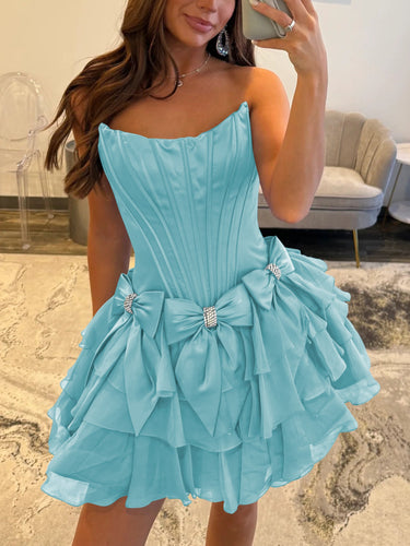 Crystal Boned Chiffon Bow Tiered Mini Ball Gown Prom Dress - Sky Blue