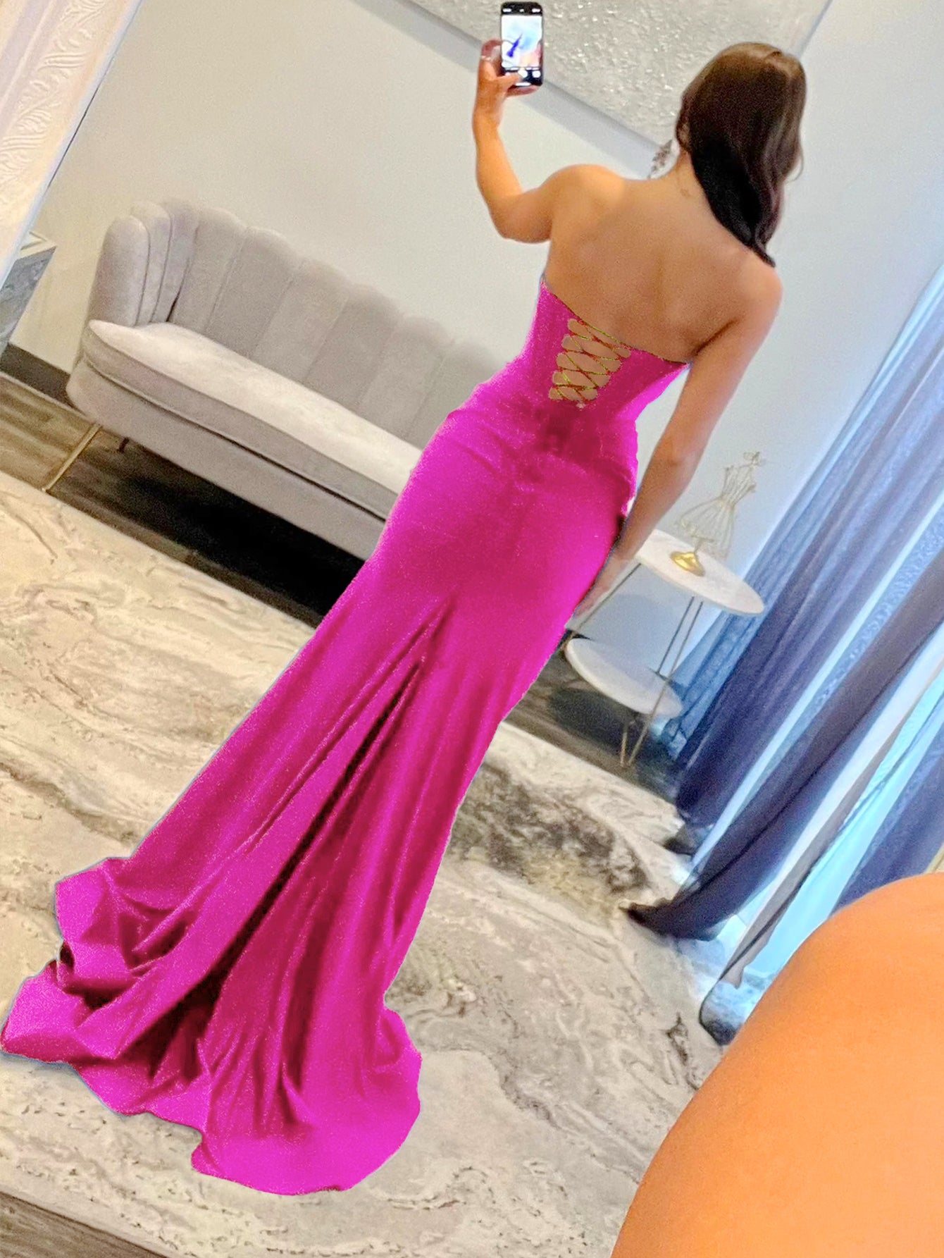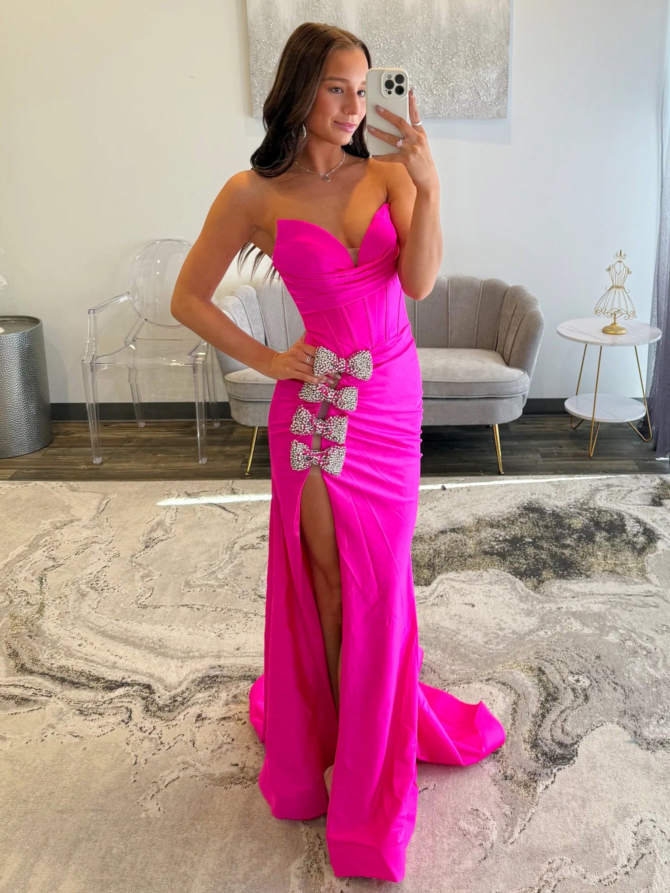 Crystal Bows Bodice Mermaid Prom Dress With Slit - Hot Pink