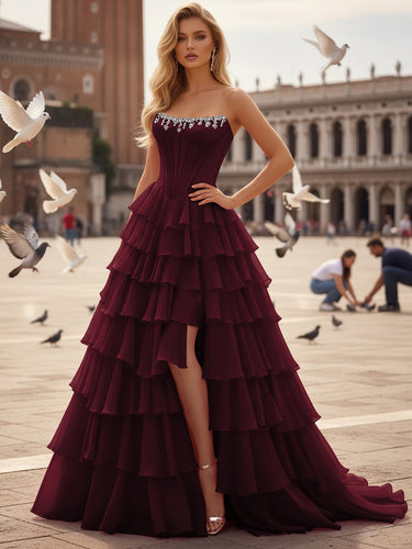 Crystal Corset Layered Ruffle Hem Long Prom Dress With Slit - Burgundy
