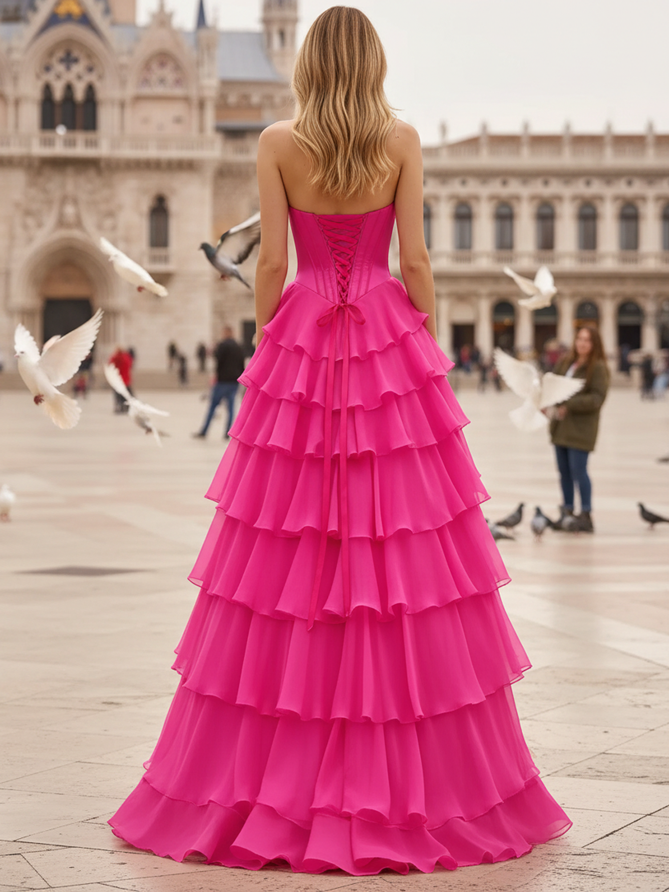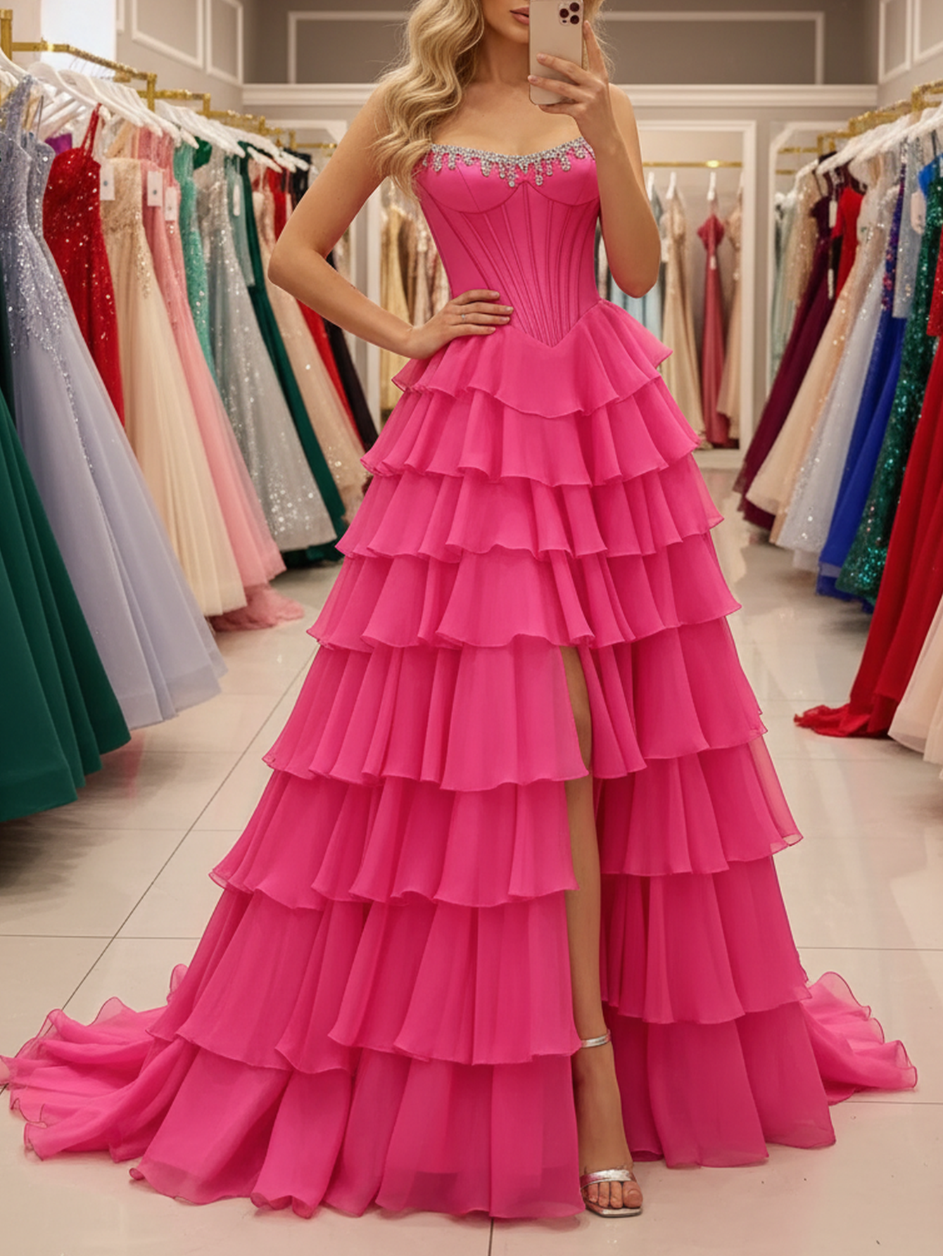 Crystal Corset Layered Ruffle Hem Long Prom Dress With Slit - Hot Pink
