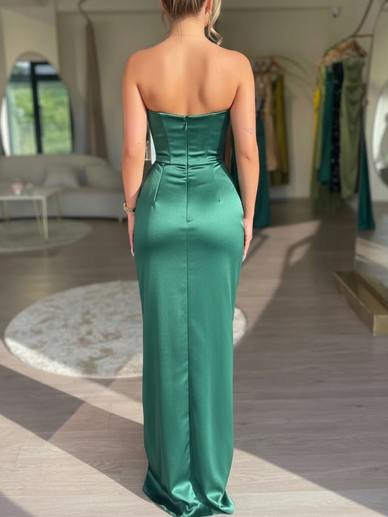 This stretch satin prom gown features crystal ruched bust on the bodice. The strapless maxi dress has a ruched and split hem. Worldprom sheath prom dresses are ideal for party, evening or festivals.
