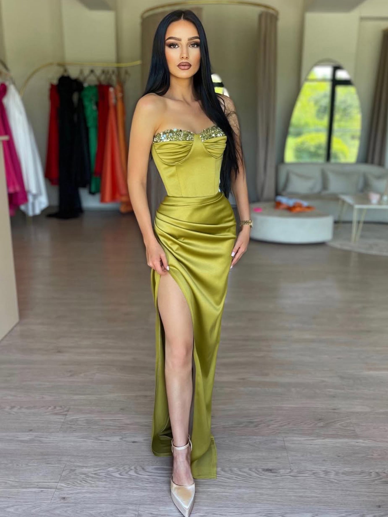 This stretch satin prom gown features crystal ruched bust on the bodice. The strapless maxi dress has a ruched and split hem. Worldprom sheath prom dresses are ideal for party, evening or festivals.