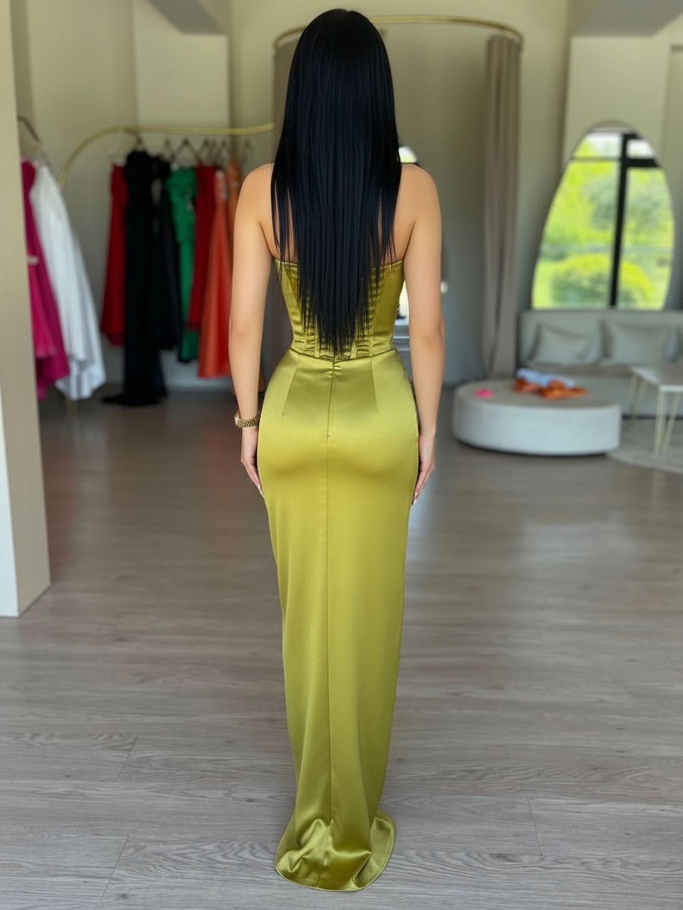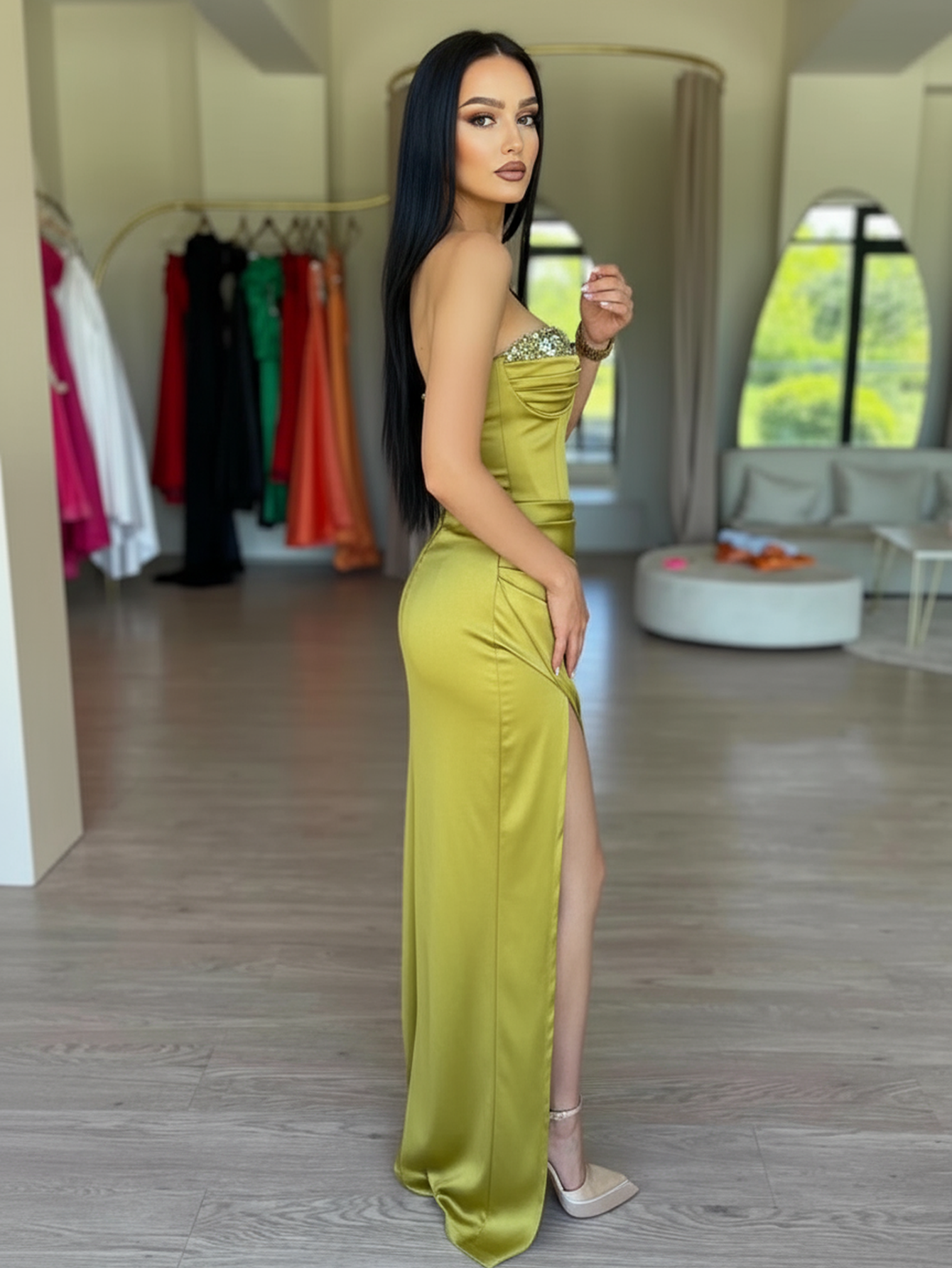 Crystal Ruched Sheath Long Prom Dress With Split - Olive Green