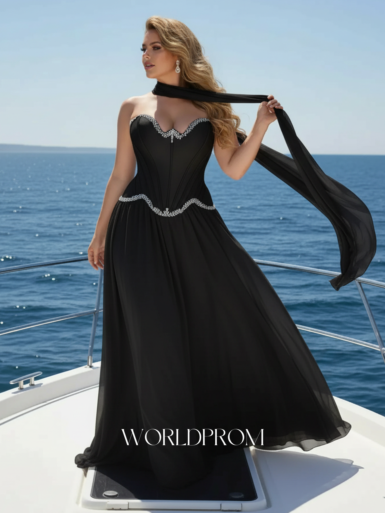 This chiffon prom gown features crystal bust with shawl on the bodice. The two pieces strapless dress has a sweetheart neck and pleated hem. Worldprom a-line prom dresses are ideal for party, evening or festivals.