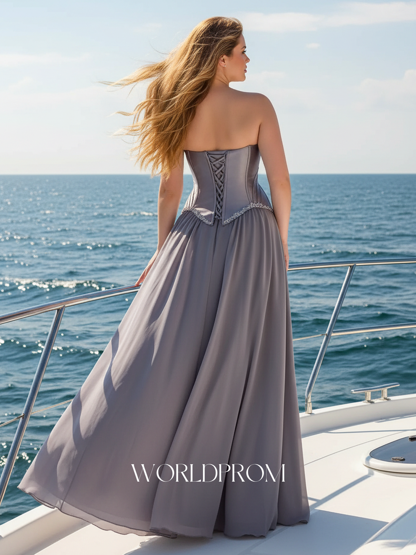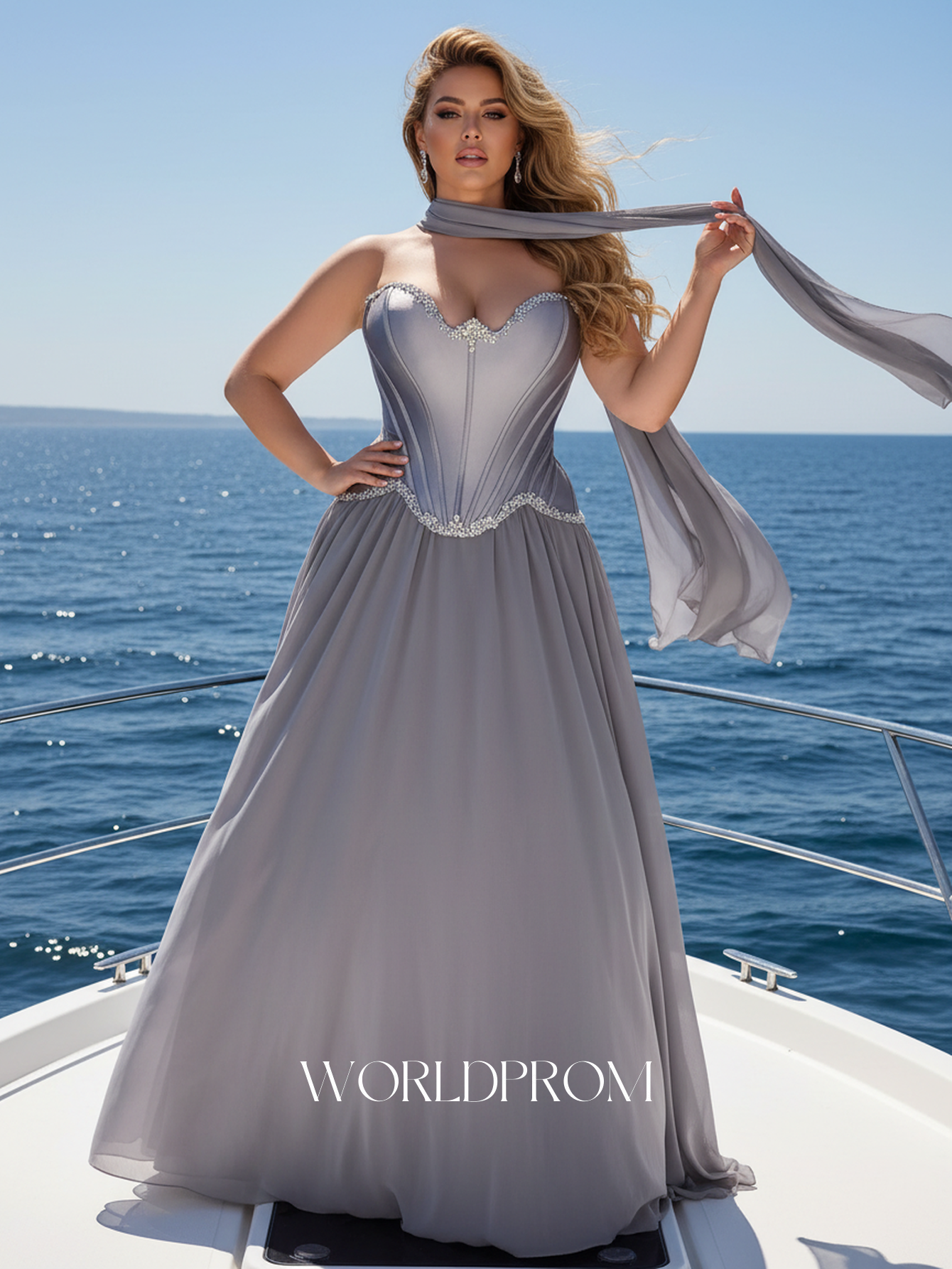 This chiffon prom gown features crystal bust with shawl on the bodice. The two pieces strapless dress has a sweetheart neck and pleated hem. Worldprom a-line prom dresses are ideal for party, evening or festivals.