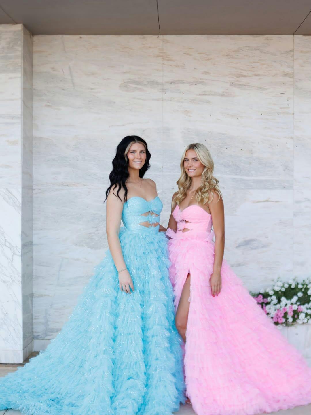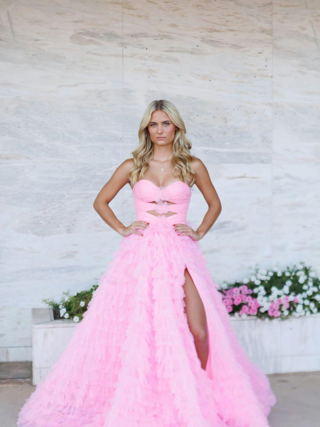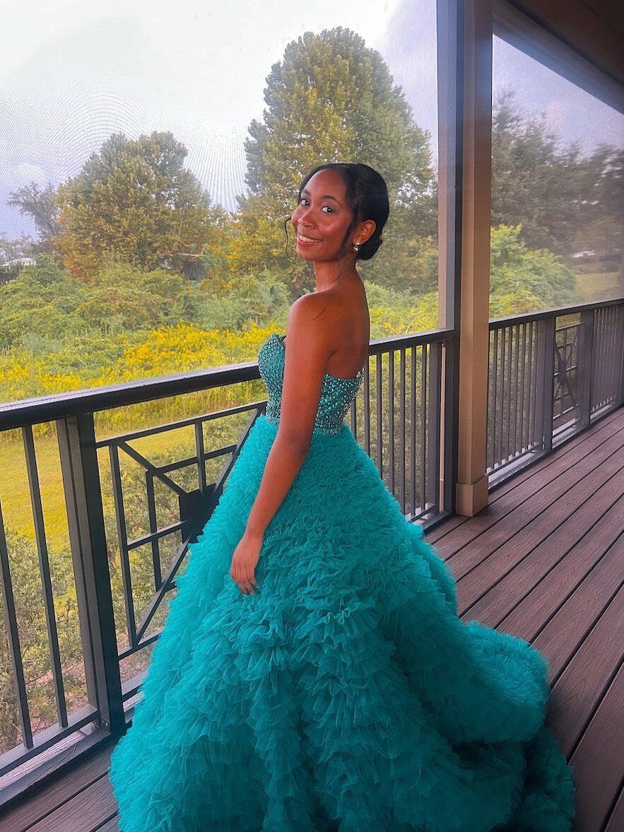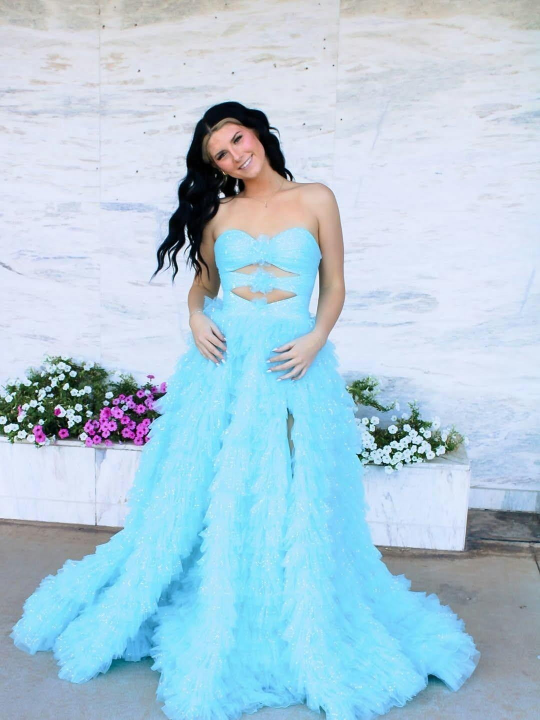 This tulle prom gown features cut front with 3d rose on the bodice. The strapless long dress has a sweetheart neck and ruffle hem. This ruffled prom dress is ideal for party, evening or festivals.