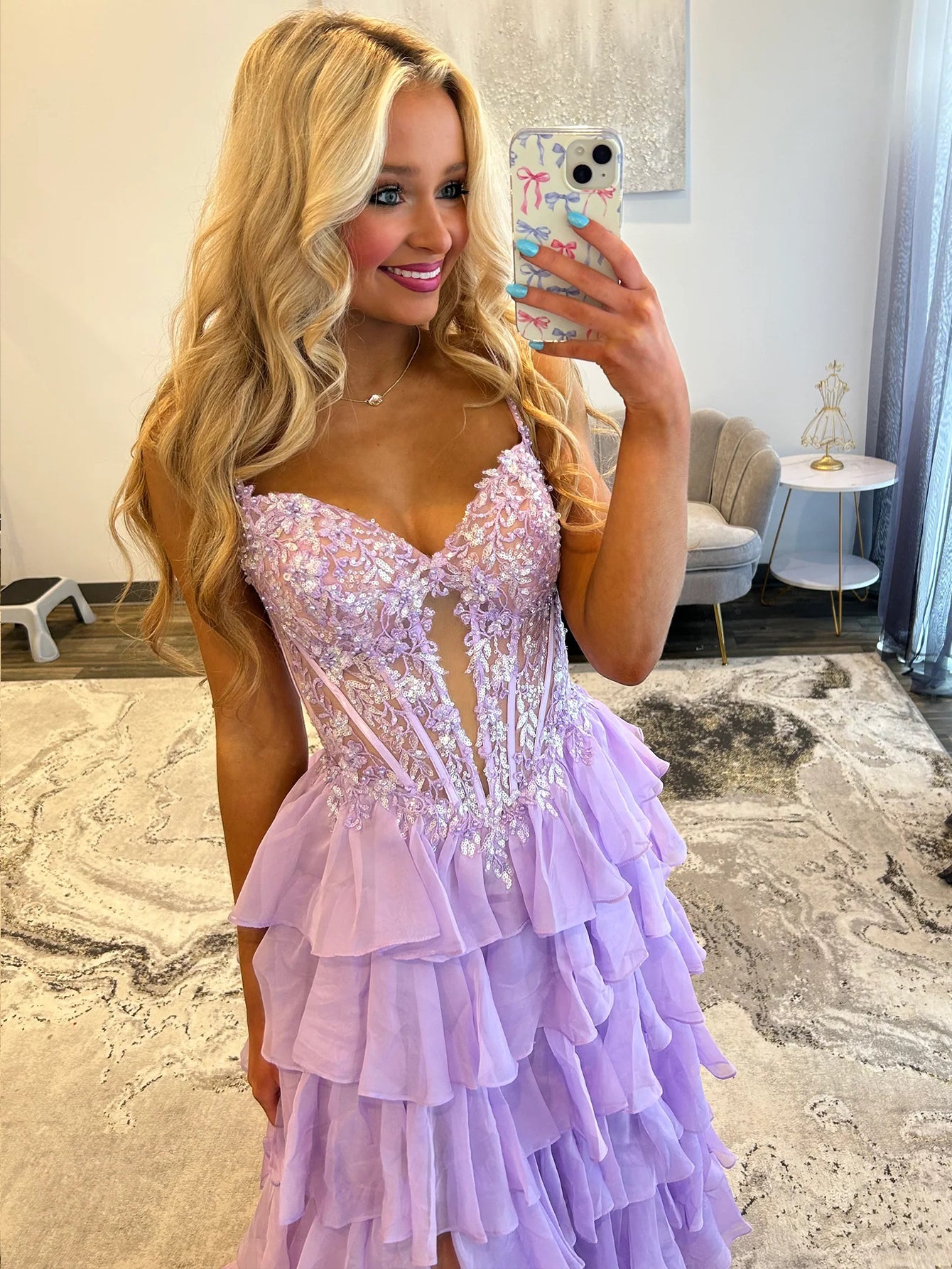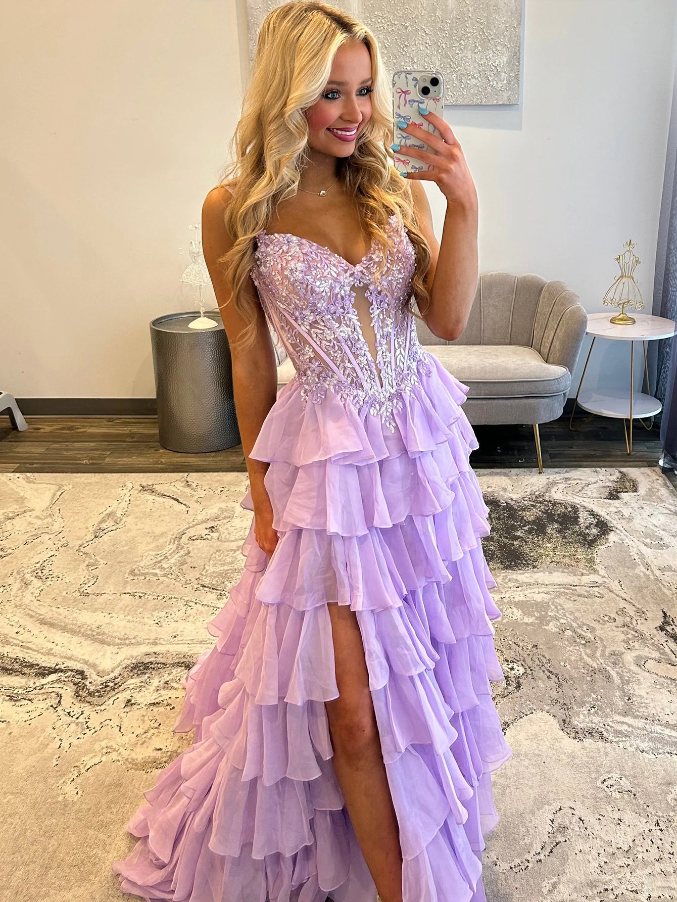 This chiffon prom gown features cut front with lace embroidery on the bodice. The strapless maxi dress has a sweetheart neckline and layered hem. This ball gown formal dress is ideal for party, evening or festivals.
