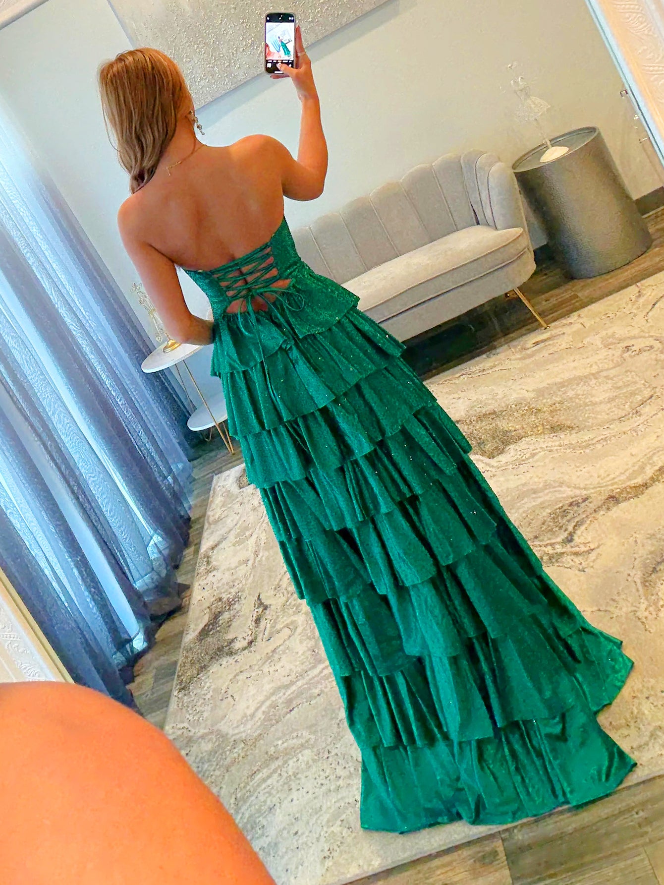 Cut Front Luxury Crystal Ruffle Ball Gown Prom Dress - Emerald Green