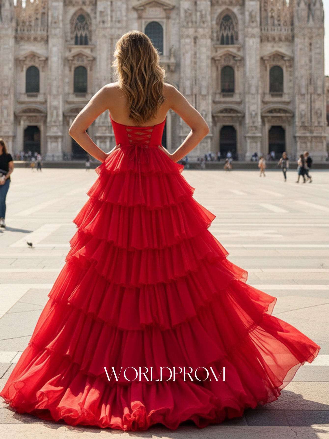 Cut Front Pleated Layered Ruffle Hem Long Prom Dress With Slit - Red