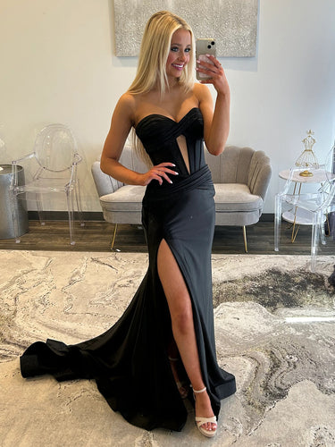 Cut Front Pleated Mermaid Prom Dress With Split - Black